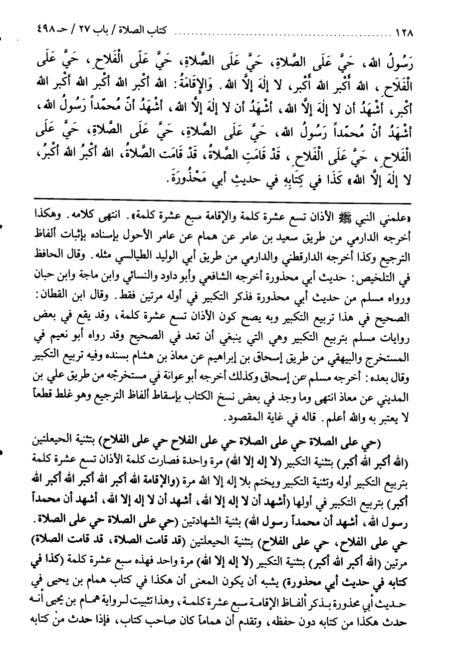 (حَيَّ عَلَى الصَّلَاةِ حَيَّ عَلَى الصَّلَاةِ حَيَّ عَلَى الْفَلَاحِ حَيَّ عَلَى الْفَلَاحِ) بِتَثْنِيَةِ الْحَيْعَلَتَيْنِ (اللَّهُ أَكْبَرُ اللَّهُ أكبر) بتثنية التكبير (لا إله ألاالله) مَرَّةٌ وَاحِدَةٌ فَصَارَتْ كَلِمَةُ الْأَذَانِ تِسْعَ عَشْرَةَ كَلِمَةً بِتَرْبِيعِ التَّكْبِيرِ أَوَّلَهُ وَتَثْنِيَةِ الشَّهَادَتَيْنِ ثُمَّ يُرَجِّعُ بِهَا مَثْنَى مَثْنَى وَتَثْنِيَةِ الْحَيْعَلَتَيْنِ وَتَثْنِيَةِ التَّكْبِيرِ وَيَخْتِمُ بِلَا إِلَهَ إِلَّا اللَّهُ مَرَّةً (وَالْإِقَامَةُ اللَّهُ أَكْبَرُ اللَّهُ أَكْبَرُ اللَّهُ أَكْبَرُ اللَّهُ أَكْبَرُ) بِتَرْبِيعِ التَّكْبِيرِ فِي أَوَّلِهَا (أَشْهَدُ أن لا إله إلا الله أشهد أن لَا إِلَهَ إِلَّا اللَّهُ أَشْهَدُ أَنَّ مُحَمَّدًا رسول الله أشهد أن محمدا رسول الله) بثنية الشَّهَادَتَيْنِ (حَيَّ عَلَى الصَّلَاةِ حَيَّ عَلَى الصَّلَاةِ حَيَّ عَلَى الْفَلَاحِ حَيَّ عَلَى الْفَلَاحِ) بِتَثْنِيَةِ الْحَيْعَلَتَيْنِ (قَدْ قَامَتِ الصَّلَاةُ قَدْ قَامَتِ الصَّلَاةُ) مَرَّتَيْنِ (اللَّهُ أَكْبَرُ اللَّهُ أَكْبَرُ) بِتَثْنِيَةِ التَّكْبِيرِ (لا إله إلاالله) مَرَّةً وَاحِدَةً فَهَذِهِ سَبْعَ عَشْرَةَ كَلِمَةً (كَذَا فِي كِتَابِهِ فِي حَدِيثِ أَبِي مَحْذُورَةَ) يُشْبِهُ أَنْ يَكُونَ الْمَعْنَى أَنَّ هَكَذَا فِي كِتَابِ هَمَّامِ بْنِ يَحْيَى فِي حَدِيثِ أَبِي مَحْذُورَةَ بِذِكْرِ أَلْفَاظِ الْإِقَامَةِ سَبْعَ عَشْرَةَ كَلِمَةً وَهَذَا تَثْبِيتٌ لِرِوَايَةِ هَمَّامِ بْنِ يَحْيَى أَنَّهُ حَدَّثَ هَكَذَا مِنْ كِتَابِهِ دُونَ حِفْظِهِ وَتَقَدَّمَ أَنَّ هَمَّامًا كَانَ صَاحِبُ كِتَابٍ فَإِذَا حَدَّثَ مِنْ كتابه