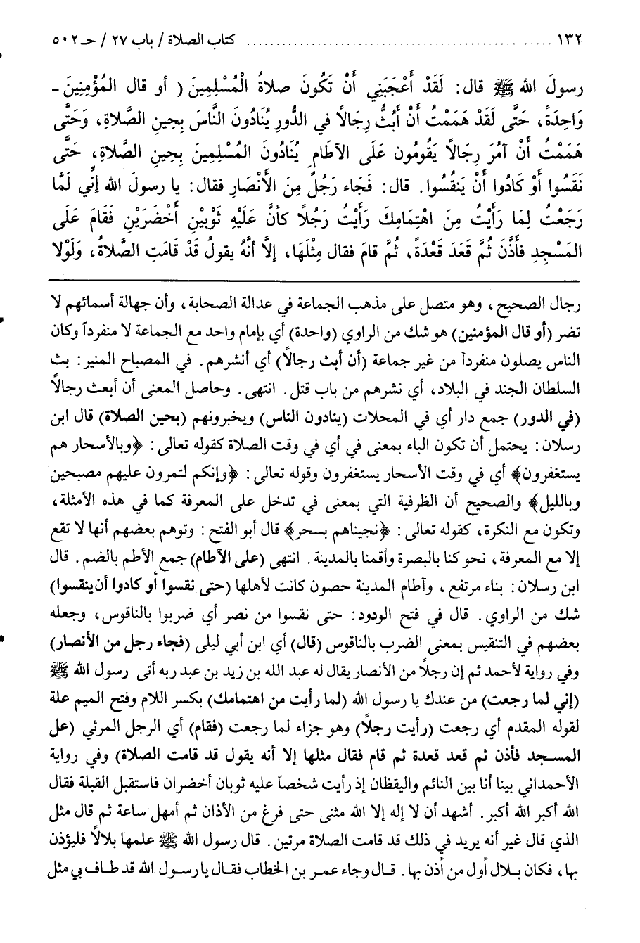 قَالَ فِي فَتْحِ الْوَدُودِ حَتَّى نَقَسُوا مِنْ نَصْرٍ أَيْ ضَرَبُوا بِالنَّاقُوسِ وَجَعَلَهُ بَعْضُهُمْ مِنَ التَّنْقِيسِ بِمَعْنَى الضَّرْبِ بِالنَّاقُوسِ (قَالَ) أي بن أَبِي لَيْلَى (فَجَاءَ رَجُلٌ مِنْ الْأَنْصَارِ) وَفِي رِوَايَةٍ لِأَحْمَدَ ثُمَّ إِنَّ رَجُلًا مِنْ الْأَنْصَارِ يُقَالُ لَهُ عَبْدُ اللَّهِ بْنُ زَيْدِ بْنِ عَبْدِ رَبِّهِ أَتَى رَسُولُ اللَّهِ صَلَّى اللَّهُ عَلَيْهِ وَسَلَّمَ (إِنِّي لَمَّا رَجَعْتُ) مِنْ عِنْدِكَ يارسول اللَّهِ (لِمَا رَأَيْتُ مِنِ اهْتِمَامِكَ) بِكَسْرِ اللَّامِ وَفَتْحِ الْمِيمِ عِلَّةً لِقَوْلِهِ الْمُقَدَّمِ أَيْ رَجَعْتُ (رَأَيْتُ رَجُلًا) وَهُوَ جَزَاءٌ لَمَّا رَجَعْتُ (فَقَامَ) أَيِ الرَّجُلُ الْمَرْئِيُّ (عَلَى الْمَسْجِدِ فَأَذَّنَ ثُمَّ قَعَدَ قَعْدَةً ثُمَّ قَامَ فَقَالَ مِثْلَهَا إِلَّا أَنَّهُ يَقُولُ قَدْ قَامَتِ الصَّلَاةُ) وَفِي رِوَايَةِ الْأَحْمَدَانِيِّ بَيْنَا أَنَا بَيْنَ النَّائِمِ وَالْيَقِظَانِ إِذْ رَأَيْتُ شَخْصًا عَلَيْهِ ثَوْبَانِ أَخْضَرَانِ فَاسْتَقْبَلَ الْقِبْلَةَ فَقَالَ اللَّهُ أَكْبَرُ اللَّهُ أَكْبَرُ