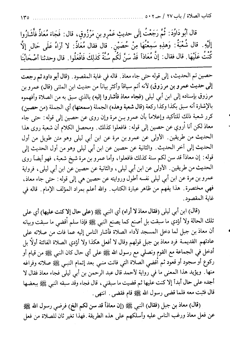 قَالَ أَبُو دَاوُدَ ثُمَّ رَجَعْتُ إِلَى حَدِيثِ عَمْرِو بْنِ مَرْزُوقٍ لِأَنَّهُ أَتَمُّ سِيَاقًا وَأَكْثَرُ بَيَانًا مِنْ حديث بن الْمُثَنَّى (قَالَ) عَمْرُو بْنُ مَرْزُوقٍ بِإِسْنَادِهِ إِلَى بن أَبِي لَيْلَى (فَجَاءَ مُعَاذٌ فَأَشَارُوا إِلَيْهِ) بِالَّذِي سَبَقَ بِهِ مِنَ الصَّلَاةِ وَأَفْهَمُوهُ بِالْإِشَارَةِ أَنَّهُ سُبِقَ بِكَذَا وَكَذَا رَكْعَةٍ (قَالَ شُعْبَةُ وَهَذِهِ) الْجُمْلَةُ (سَمِعْتُهَا) أَيِ الْجُمْلَةَ (مِنْ حُصَيْنٍ) كَرَّرَ شُعْبَةُ ذَلِكَ لِلتَّأْكِيدِ وَإِعْلَامًا بِأَنَّ عَمْرَو بْنَ مُرَّةَ وَإِنْ رَوَى عَنْ حُصَيْنٍ إِلَى قَوْلِهِ حَتَّى جَاءَ مُعَاذٌ لَكِنْ أَنَا أَرْوِي عَنْ حُصَيْنٍ إِلَى قَوْلِهِ فَافْعَلُوا كَذَلِكَ