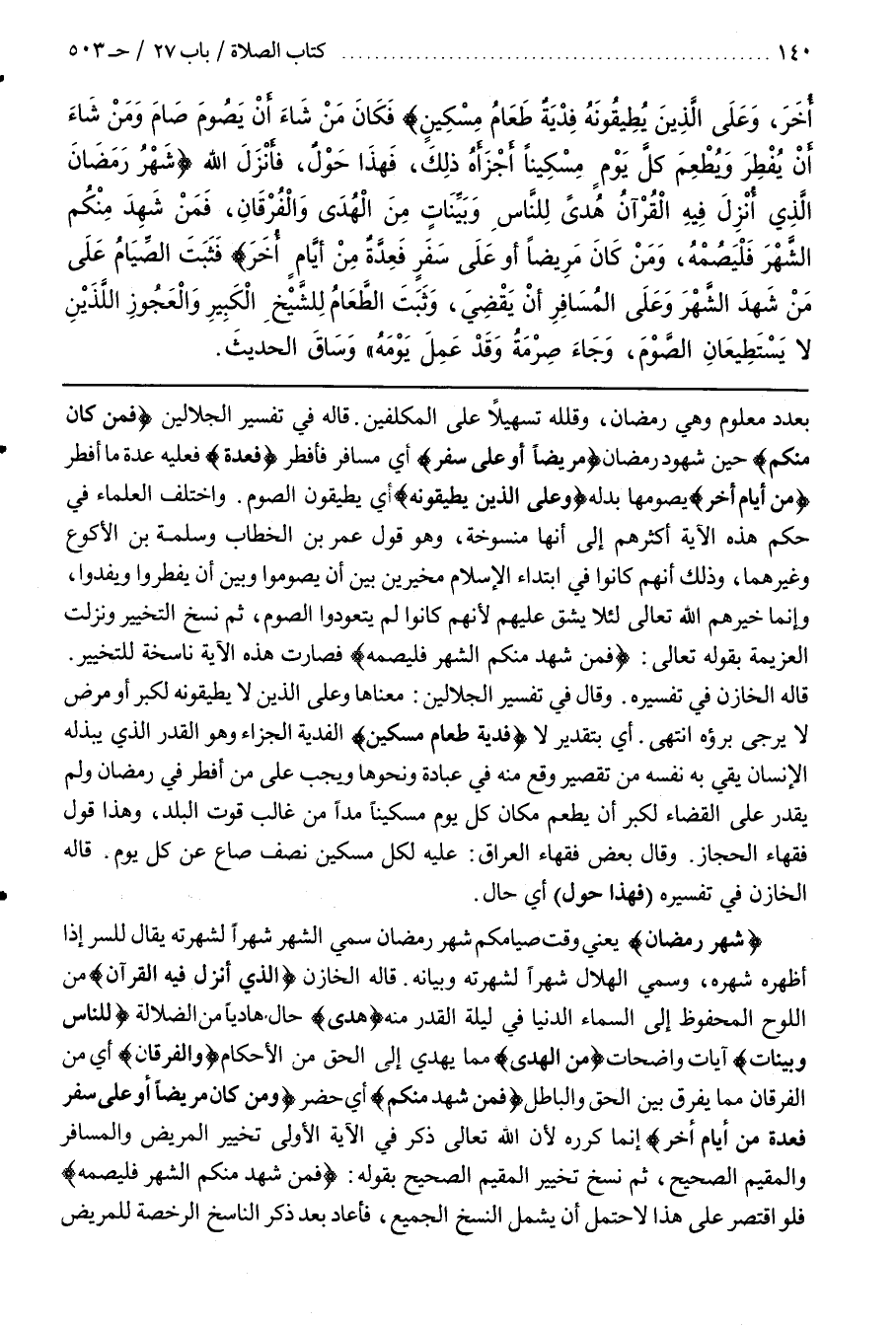 شَهْرُ رَمَضَانَ يَعْنِي وَقْتُ صِيَامِكُمْ شَهْرُ رَمَضَانَ سُمِّيَ الشَّهْرُ شَهْرًا لِشُهْرَتِهِ يُقَالُ لِلسِّرِّ إِذَا أَظْهَرَهُ شَهَرَهُ وَسُمِّيَ الْهِلَالُ شَهْرًا لِشُهْرَتِهِ وَبَيَانِهِ قَالَهُ الْخَازِنُ الَّذِي أُنْزِلَ فِيهِ الْقُرْآنُ مِنَ اللَّوْحِ الْمَحْفُوظِ إِلَى السَّمَاءِ الدُّنْيَا فِي لَيْلَةِ الْقَدْرِ مِنْهُ هُدًى حَالٌ هَادِيًا مِنَ الضَّلَالَةِ لِلنَّاسِ وَبَيِّنَاتٍ آيَاتٍ وَاضِحَاتٍ مِنَ الْهُدَى مِمَّا يَهْدِي إِلَى الْحَقِّ مِنَ الْأَحْكَامِ وَالْفُرْقَانِ أَيْ مِنَ الْفُرْقَانِ مِمَّا يُفَرِّقُ بَيْنَ الْحَقِّ وَالْبَاطِلِ فَمَنْ شَهِدَ مِنْكُمْ أَيْ حَضَرَ وَمَنْ كَانَ مَرِيضًا أَوْ عَلَى سفر فعدة من أيام أخر إِنَّمَا كَرَّرَهُ لِأَنَّ اللَّهَ تَعَالَى ذَكَرَ فِي الْآيَةِ الْأُولَى تَخْيِيرُ الْمَرِيضِ وَالْمُسَافِرِ وَالْمُقِيمِ الصَّحِيحِ ثُمَّ نُسِخَ تَخْيِيرُ الْمُقِيمِ الصَّحِيحِ بِقَوْلِهِ فَمَنْ شهد منكم الشهر فليصمه فَلَوِ اقْتَصَرَ عَلَى هَذَا لَاحْتَمَلَ أَنْ يَشْمَلَ النَّسْخُ الْجَمِيعَ فَأَعَادَ بَعْدَ ذِكْرِ النَّاسِخِ الرُّخْصَةَ للمريض