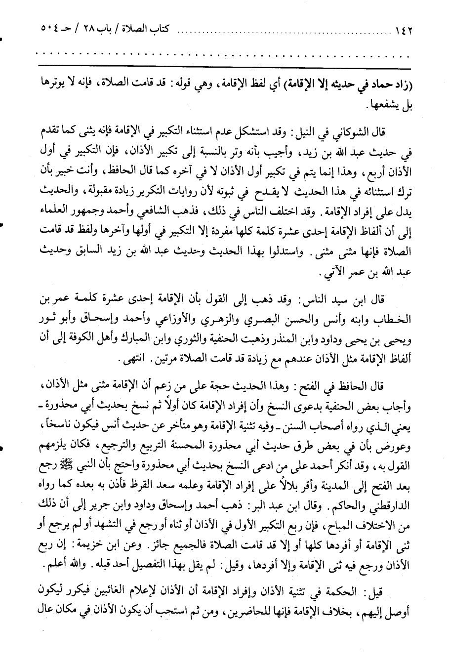 قَالَ الشَّوْكَانِيُّ فِي النَّيْلِ وَقَدِ اسْتُشْكِلَ عَدَمُ اسْتِثْنَاءِ التَّكْبِيرِ فِي الْإِقَامَةِ فَإِنَّهُ يُثَنَّى كَمَا تَقَدَّمَ فِي حَدِيثِ عَبْدِ اللَّهِ بْنِ زَيْدٍ وَأُجِيبَ بِأَنَّهُ وِتْرٌ بِالنِّسْبَةِ إِلَى تَكْبِيرِ الْأَذَانِ فَإِنَّ التَّكْبِيرَ فِي أَوَّلِ الْأَذَانِ أَرْبَعٌ وَهَذَا إِنَّمَا يَتِمُّ فِي تَكْبِيرِ أَوَّلِ الْأَذَانِ لَا فِي آخِرِهِ كَمَا قَالَ الْحَافِظُ وَأَنْتَ خَبِيرٌ بِأَنَّ تَرْكَ اسْتِثْنَائِهِ فِي هَذَا الْحَدِيثِ لَا يَقْدَحُ فِي ثُبُوتِهِ لِأَنَّ رِوَايَاتِ التَّكْرِيرِ زِيَادَةٌ مَقْبُولَةٌ وَالْحَدِيثُ يَدُلُّ عَلَى إِفْرَادِ الْإِقَامَةِ
