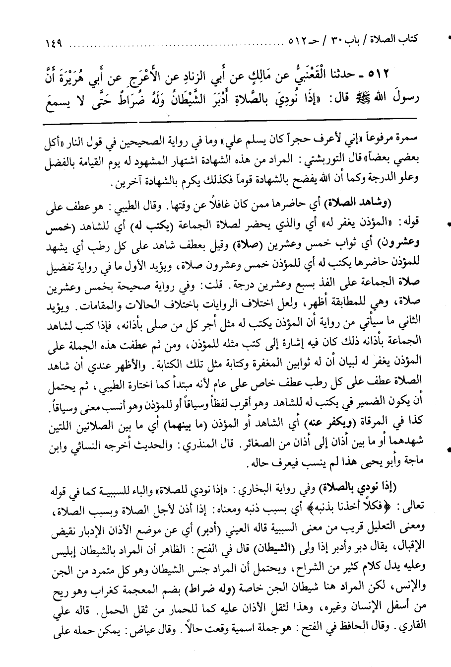[516] (إِذَا نُودِيَ بِالصَّلَاةِ) وَفِي رِوَايَةِ الْبُخَارِيِّ إِذَا نُودِيَ لِلصَّلَاةِ وَالْبَاءِ لِلسَّبَبِيَّةِ كَمَا فِي قوله تعالى فكلا أخذنا بذنبه أَيْ بِسَبَبِ ذَنْبِهِ وَمَعْنَاهُ إِذَا أَذَّنَ لِأَجْلِ الصَّلَاةِ وَبِسَبَبِ الصَّلَاةِ وَمَعْنَى التَّعْلِيلِ قَرِيبٌ مِنْ مَعْنَى السَّبَبِيَّةِ قَالَهُ الْعَيْنِيُّ (أَدْبَرَ) أَيْ عَنْ مَوْضِعِ الْأَذَانِ الْإِدْبَارُ نَقِيضُ الْإِقْبَالِ يُقَالُ دَبَرَ وَأَدْبَرَ إِذَا وَلَّى (الشَّيْطَانُ) قَالَ فِي الْفَتْحِ الظَّاهِرُ أَنَّ الْمُرَادَ بِالشَّيْطَانِ إِبْلِيسُ وَعَلَيْهِ يَدُلُّ كَلَامُ كَثِيرٍ مِنَ الشُّرَّاحِ وَيَحْتَمِلُ أَنَّ الْمُرَادَ جِنْسُ الشَّيْطَانِ وَهُوَ كُلُّ مُتَمَرِّدٍ مِنَ الْجِنِّ وَالْإِنْسِ لَكِنِ الْمُرَادُ هُنَا شَيْطَانُ الْجِنِّ خَاصَّةً (وَلَهُ ضُرَاطٌ) بِضَمِّ الْمُعْجَمَةِ كَغُرَابٍ وَهُوَ رِيحٌ مِنْ أَسْفَلِ الْإِنْسَانِ وَغَيْرِهِ وَهَذَا لِثِقَلِ الْأَذَانِ عَلَيْهِ كَمَا لِلْحِمَارِ مِنْ ثِقَلِ الْحَمْلِ