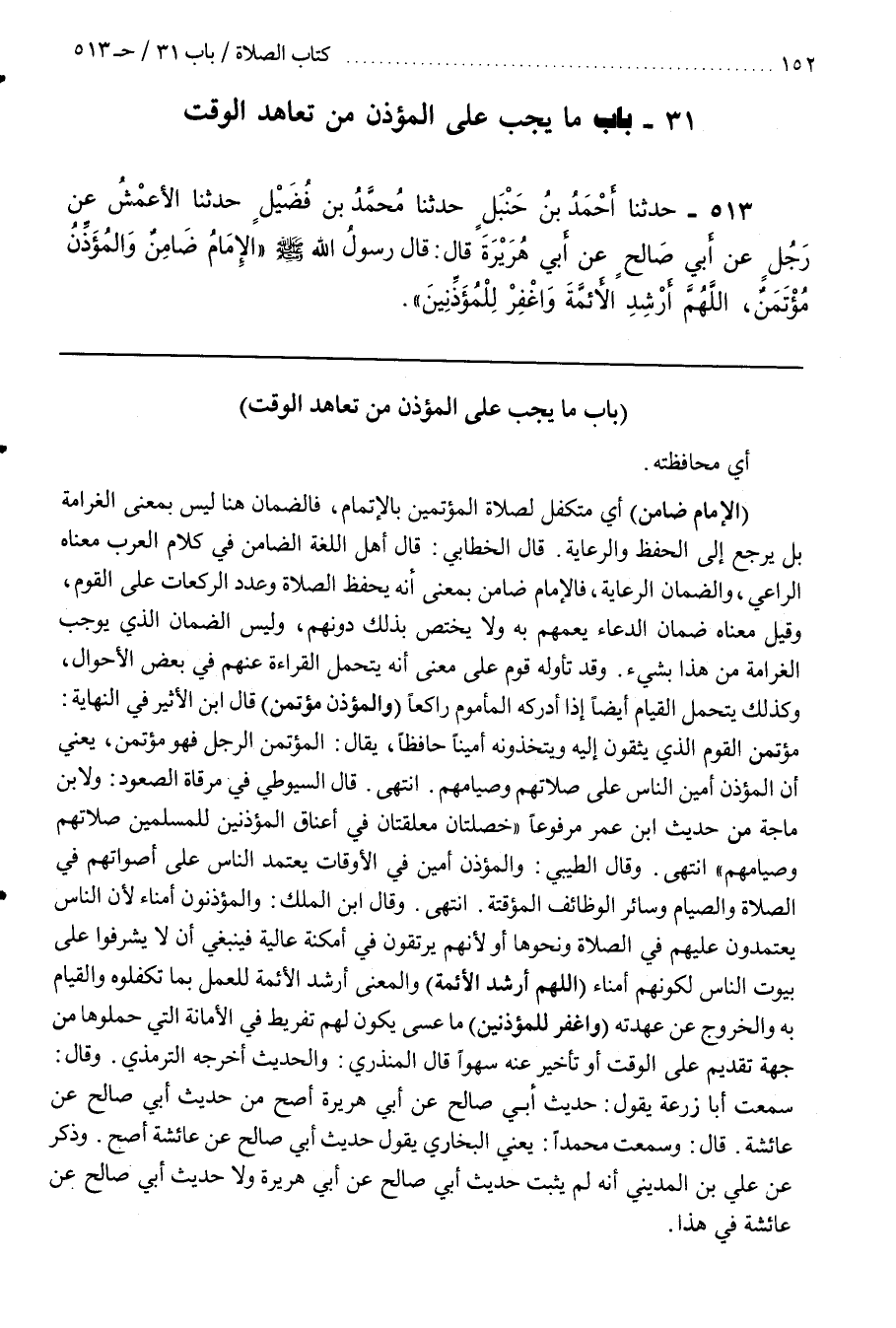وقال بن الْمَلَكِ وَالْمُؤَذِّنُونَ أُمَنَاءُ لِأَنَّ النَّاسَ يَعْتَمِدُونَ عَلَيْهِمْ فِي الصَّلَاةِ وَنَحْوِهَا أَوْ لِأَنَّهُمْ يَرْتَقُونَ فِي أَمْكِنَةٍ عَالِيَةٍ فَيَنْبَغِي أَنْ لَا يُشْرِفُوا عَلَى بُيُوتِ النَّاسِ لِكَوْنِهِمْ أُمَنَاءَ (اللَّهُمَّ أَرْشِدِ الْأَئِمَّةَ) والمعنى أرشد الأئمة للعلم بما تكلفوه وَالْقِيَامِ بِهِ وَالْخُرُوجِ عَنْ عُهْدَتِهِ (وَاغْفِرْ لِلْمُؤَذِّنِينَ) مَا عَسَى يَكُونُ لَهُمْ تَفْرِيطٌ فِي الْأَمَانَةِ الَّتِي حَمَلُوهَا مِنْ جِهَةِ تَقْدِيمٍ عَلَى الْوَقْتِ أَوْ تَأْخِيرٍ عَنْهُ سَهْوًا قَالَ الْمُنْذِرِيُّ وَالْحَدِيثُ أَخْرَجَهُ التِّرْمِذِيُّ وَقَالَ سَمِعْتُ أَبَا زُرْعَةَ يَقُولُ حَدِيثُ أَبِي صَالِحٍ عَنْ أَبِي هُرَيْرَةَ أَصَحُّ مِنْ حَدِيثِ أَبِي صَالِحٍ عَنْ عَائِشَةَ قَالَ وَسَمِعْتُ مُحَمَّدًا يَعْنِي الْبُخَارِيَّ يَقُولُ حَدِيثُ أَبِي صَالِحٍ عَنْ عَائِشَةَ أَصَحُّ