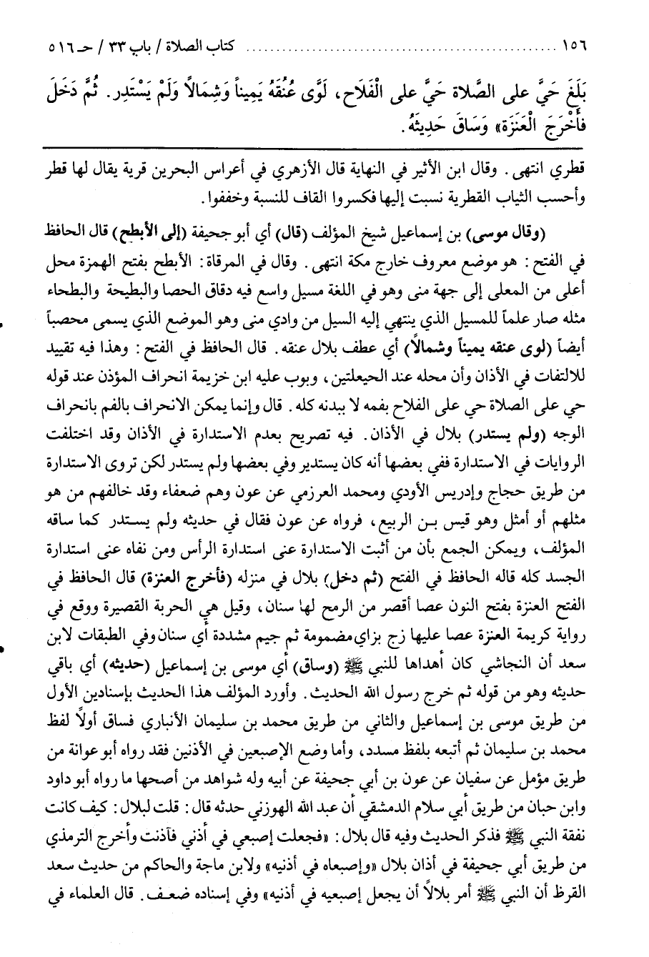 فِيهِ تَصْرِيحٌ بِعَدَمِ الِاسْتِدَارَةِ فِي الْأَذَانِ وَقَدِ اخْتَلَفَتِ الرِّوَايَاتُ فِي الِاسْتِدَارَةِ فَفِي بَعْضُهَا أَنَّهُ كَانَ يَسْتَدِيرُ وَفِي بَعْضِهَا وَلَمْ يَسْتَدِرْ لَكِنْ تُرْوَى الِاسْتِدَارَةُ مِنْ طَرِيقِ حَجَّاجٍ وَإِدْرِيسَ الْأَوْدِيِّ وَمُحَمَّدٍ الْعَرْزَمِيِّ عَنْ عَوْنٍ وَهُمْ ضُعَفَاءُ وَقَدْ خَالَفَهُمْ مَنْ هُوَ مِثْلُهُمْ أَوْ أَمْثَلُ وَهُوَ قَيْسُ بْنُ الرَّبِيعِ فَرَوَاهُ عَنْ عَوْنٍ فَقَالَ فِي حَدِيثِهِ وَلَمْ يَسْتَدِرْ كَمَا سَاقَهُ الْمُؤَلِّفُ وَيُمْكِنُ الْجَمْعُ بِأَنَّ مَنْ أَثْبُتَ الِاسْتِدَارَةَ عَنَى اسْتِدَارَةَ الرَّأْسِ وَمَنْ نَفَاهُ عَنَى اسْتِدَارَةَ الْجَسَدِ كُلِّهِ قَالَهُ الْحَافِظُ فِي الْفَتْحِ (ثُمَّ دَخَلَ) بِلَالٌ فِي مَنْزِلِهِ (فَأَخْرَجَ الْعَنَزَةَ) قَالَ الْحَافِظُ فِي الْفَتْحِ الْعَنَزَةُ بِفَتْحِ النُّونِ عَصًا أَقْصَرُ مِنَ الرُّمْحِ لَهَا سِنَانٌ وَقِيلَ هِيَ الْحَرْبَةُ الْقَصِيرَةُ وَوَقَعَ فِي رِوَايَةِ كَرِيمَةَ الْعَنَزَةُ عَصًا عَلَيْهَا زج بزاي مَضْمُومَةٍ ثُمَّ جِيمٍ مُشَدَّدَةٍ أَيْ سِنَانٌ وَفِي الطَّبَقَاتِ لِابْنِ سَعْدٍ أَنَّ النَّجَاشِيَّ كَانَ أَهْدَاهَا لِلنَّبِيِّ صَلَّى اللَّهُ عَلَيْهِ وَسَلَّمَ (وَسَاقَ) أَيْ مُوسَى بْنُ إِسْمَاعِيلَ (حَدِيثَهُ) أَيْ بَاقِي حَدِيثِهِ وَهُوَ مِنْ قَوْلِهِ ثُمَّ خَرَجَ رَسُولُ اللَّهِ الْحَدِيثُ
