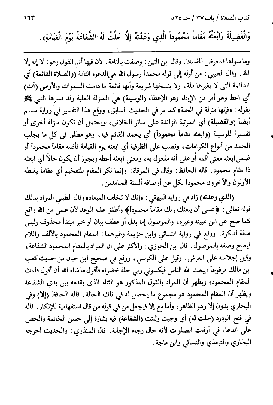 وَقَالَ الطِّيبِيُّ مِنْ أَوَّلِهِ إِلَى قَوْلِهِ مُحَمَّدًا رَسُولُ اللَّهِ هِيَ الدَّعْوَةُ التَّامَّةُ (وَالصَّلَاةِ الْقَائِمَةِ) أَيِ الدَّائِمَةِ الَّتِي لَا يُغَيِّرُهَا مِلَّةٌ وَلَا يَنْسَخُهَا شَرِيعَةٌ وأنها قائمة ما دامت السماوات وَالْأَرْضُ (آتِ) أَيِ اعْطِ وَهُوَ أَمْرٌ مِنَ الْإِيتَاءِ وَهُوَ الْإِعْطَاءُ (الْوَسِيلَةَ) هِيَ الْمَنْزِلَةُ الْعَلِيَّةُ وَقَدْ فَسَّرَهَا النَّبِيُّ صَلَّى اللَّهُ عَلَيْهِ وَسَلَّمَ بِقَوْلِهِ فَإِنَّهَا مَنْزِلَةٌ فِي الْجَنَّةِ كَمَا مَرَّ فِي الْحَدِيثِ السَّابِقِ وَوَقَعَ هَذَا التَّفْسِيرُ فِي رِوَايَةِ مُسْلِمٍ أَيْضًا (وَالْفَضِيلَةَ) أَيِ الْمَرْتَبَةَ الزَّائِدَةَ عَلَى سَائِرِ الْخَلَائِقِ وَيَحْتَمِلُ أَنْ تَكُونَ مَنْزِلَةٌ أُخْرَى أَوْ تَفْسِيرًا لِلْوَسِيلَةِ (وَابْعَثْهُ مَقَامًا مَحْمُودًا) أَيْ يُحْمَدُ الْقَائِمُ فِيهِ وَهُوَ مُطْلَقٌ فِي كُلِّ مَا يَجْلُبُ الْحَمْدَ مِنْ أَنْوَاعِ الْكَرَامَاتِ وَنُصِبَ عَلَى الظَّرْفِيَّةِ أَيِ ابْعَثْهُ يَوْمَ الْقِيَامَةِ فَأَقِمْهُ مَقَامًا مَحْمُودًا أَوْ ضَمَّنَ ابْعَثْهُ مَعْنَى أَقِمْهُ أَوْ عَلَى أَنَّهُ مَفْعُولٌ بِهِ وَمَعْنَى ابْعَثْهُ أَعْطِهِ وَيَجُوزُ أَنْ يَكُونَ حَالًا أَيِ ابْعَثْهُ ذَا مَقَامٍ مَحْمُودِ