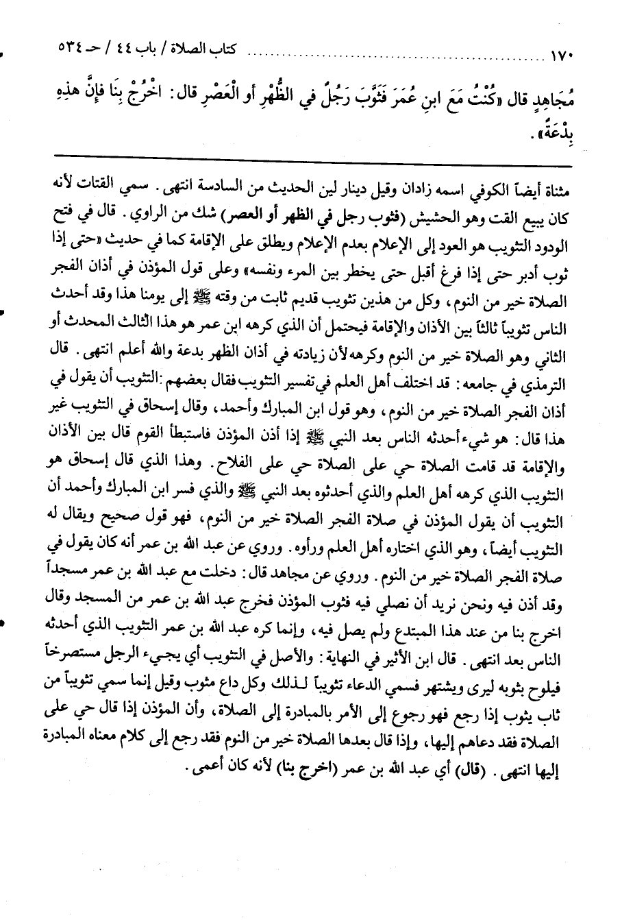 وَرُوِيَ عَنْ مُجَاهِدٍ قَالَ دَخَلْتُ مَعَ عَبْدِ اللَّهِ بْنِ عُمَرَ مَسْجِدًا وَقَدْ أُذِّنَ فِيهِ وَنَحْنُ نُرِيدُ أَنْ نُصَلِّيَ فِيهِ فَثَوَّبَ الْمُؤَذِّنُ فَخَرَجَ عَبْدُ اللَّهِ بْنُ عُمَرَ مِنَ الْمَسْجِدِ وَقَالَ اخْرُجْ بِنَا مِنْ عِنْدِ هَذَا الْمُبْتَدِعِ وَلَمْ يُصَلِّ فِيهِ وَإِنَّمَا كَرِهَ عَبْدُ اللَّهِ بْنُ عُمَرَ التَّثْوِيبَ الَّذِي أَحْدَثَهُ النَّاسُ بعد انتهى