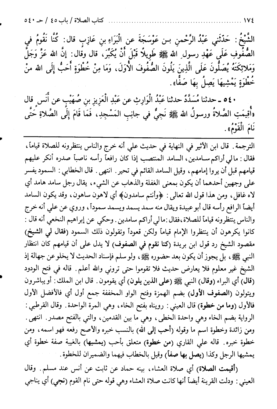 وَحُكِيَ عَنْ إِبْرَاهِيمَ النَّخَعِيِّ أَنَّهُ قَالَ كَانُوا يَكْرَهُونَ أَنْ يَنْتَظِرُوا الْإِمَامَ قِيَامًا وَلَكِنْ قُعُودًا وَتَقُولُونَ ذَلِكَ السُّمُودَ (فَقَالَ لِيَ الشيخ) مقصود الشيخ رد قول بن بُرَيْدَةَ (كُنَّا نَقُومُ فِي الصُّفُوفِ) لَا يَدُلُّ عَلَى أَنَّ قِيَامَهُمْ كَانَ انْتِظَارُ النَّبِيِّ صَلَّى اللَّهُ عَلَيْهِ وَسَلَّمَ بَلْ يَجُوزُ أَنْ يَكُونَ بَعْدَ حُضُورِهِ صَلَّى اللَّهُ عَلَيْهِ وَسَلَّمَ وَلَوْ سُلِّمَ فَإِسْنَادُ الْحَدِيثِ لَا يَخْلُو عَنْ جَهَالَةٍ إِذِ الشَّيْخُ غَيْرُ مَعْلُومٍ فَلَا يُعَارِضُ حَدِيثَ فَلَا تَقُومُوا حَتَّى تَرَوْنِي وَاللَّهُ أَعْلَمُ