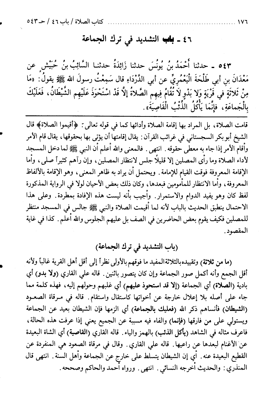 قَالَهُ فِي مِرْقَاةِ الصُّعُودِ (الشَّيْطَانُ) فَأَنْسَاهُمْ ذِكْرَ اللَّهِ (فَعَلَيْكَ بِالْجَمَاعَةِ) أَيِ الْزَمْهَا فَإِنَّ الشَّيْطَانَ بَعِيدٌ عَنِ الْجَمَاعَةِ وَيَسْتَوْلِي عَلَى مَنْ فَارَقَهَا (فَإِنَّمَا) وَالْفَاءُ فِيهِ مُسَبَّبَةٌ عَنِ الْجَمِيعِ يَعْنِي إِذَا عَرَفْتَ هَذِهِ الْحَالَةَ فَاعْرِفْ مِثَالَهُ فِي الشاهد (يأكل الذئب) بالهمز والياء