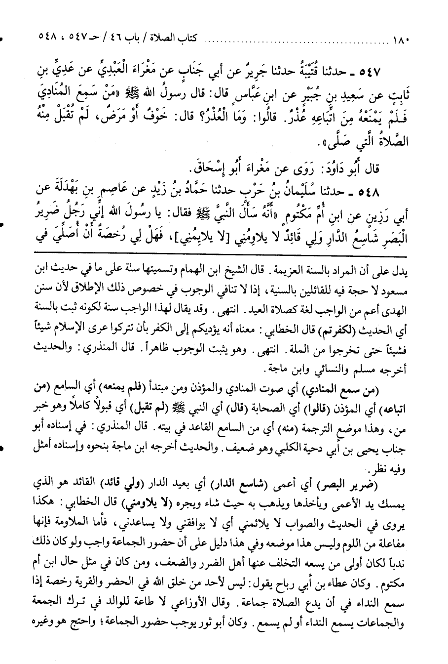 [552] (ضَرِيرُ الْبَصَرِ) أَيْ أَعْمَى (شَاسِعُ الدَّارِ) أَيْ بَعِيدُ الدَّارِ (وَلِي قَائِدٌ) الْقَائِدُ هُوَ الَّذِي يُمْسِكُ يَدَ الْأَعْمَى وَيَأْخُذُهَا وَيَذْهَبُ بِهِ حَيْثُ شَاءَ وَيَجُرُّهُ (لَا يُلَاوِمُنِي) قَالَ الْخَطَّابِيُّ هَكَذَا يُرْوَى فِي الْحَدِيثِ وَالصَّوَابُ لَا يُلَائِمُنِي أَيْ لَا يُوَافِقُنِي وَلَا يُسَاعِدُنِي فَأَمَّا الْمُلَاوَمَةُ فَإِنَّهَا مُفَاعَلَةٌ مِنَ اللَّوْمِ وَلَيْسَ هَذَا مَوْضِعَهُ وَفِي هَذَا دَلِيلٌ عَلَى أَنَّ حُضُورَ الْجَمَاعَةِ وَاجِبٌ وَلَوْ كَانَ ذَلِكَ نَدْبًا لَكَانَ أَوْلَى مَنْ يَسَعُهُ التَّخَلُّفُ عَنْهَا أَهْلُ الضَّرَرِ وَالضَّعْفِ وَمَنْ كَانَ في مثل حال بن أُمِّ مَكْتُومٍ