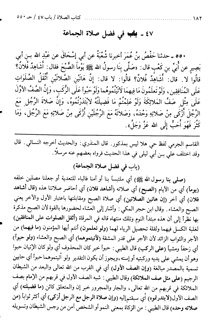 وقال بن حَجَرٍ الْمَكِّيِّ وَأَشَارَ إِلَى الْعِشَاءِ لِحُضُورِهَا بِالْقُوَّةِ لِأَنَّ الصُّبْحَ مُذَكِّرَةٌ بِهَا نَظَرًا إِلَى أَنَّ هَذِهِ مُبْتَدَأُ النَّوْمِ وَتِلْكَ مُنْتَهَاهُ قَالَهُ فِي الْمِرْقَاةِ (أَثْقَلُ الصَّلَوَاتِ عَلَى الْمُنَافِقِينَ) لِغَلَبَةِ الْكَسَلِ فِيهِمَا وَلِقِلَّةِ تَحْصِيلِ الرِّيَاءِ لَهُمَا (وَلَوْ تَعْلَمُونَ) أَنْتُمْ أَيّهَا الْمُؤْمِنُونَ (مَا فِيهِمَا) مِنَ الْأَجْرِ وَالثَّوَابِ الزَّائِدِ لِأَنَّ الْأَجْرَ عَلَى قَدْرِ الْمَشَقَّةِ (لَأَتَيْتُمُوهُمَا) أَيِ الصُّبْحَ وَالْعِشَاءَ (وَلَوْ حَبْوًا) أَيْ زَحْفًا وَمَشْيًا (عَلَى الرُّكَبِ) قَالَ الطِّيبِيُّ حَبْوًا خَبَرُ كَانَ الْمَحْذُوفُ أَيْ وَلَوْ كَانَ الْإِتْيَانُ حَبْوًا وَهُوَ أَنْ يَمْشِيَ عَلَى يَدَيْهِ وَرُكْبَتَيْهِ أَوِ اسْتِهِ وَيَجُوزُ أَنْ يَكُونَ التَّقْدِيرُ وَلَوْ أَتَيْتُمُوهُمَا حَبْوًا أَيْ حَابِينَ تَسْمِيَةً بِالْمَصْدَرِ مُبَالَغَةً (وَإِنَّ الصَّفَّ الْأَوَّلَ) أَيْ فِي الْقُرْبِ مِنَ اللَّهِ تَعَالَى وَالْبُعْدِ مِنَ الشَّيْطَانِ الرَّجِيمِ (عَلَى مِثْلِ صَفِّ الْمَلَائِكَةِ) وَقَالَ الطِّيبِيُّ شَبَّهَ الصَّفَّ الْأَوَّلَ فِي قُرْبِهِمْ مِنَ الْإِمَامِ بِصَفِّ الْمَلَائِكَةِ فِي قُرْبِهِمْ مِنَ اللَّهِ تَعَالَى وَالْجَارُّ وَالْمَجْرُورُ خَبَرُ إِنَّ وَالْمُتَعَلِّقُ كَائِنٌ (مَا فَضِيلَتُهُ) أَيِ الصف الأول (لا بتدرتموه) أَيْ سَبَقْتُمْ إِلَيْهِ (وَإِنَّ صَلَاةَ الرَّجُلِ مَعَ الرَّجُلِ أَزْكَى) أَيْ أَكْثَرُ ثَوَابًا (مِنْ صَلَاتِهِ وَحْدَهُ) قَالَ الطِّيبِيُّ مِنَ الزَّكَاةِ بِمَعْنَى النُّمُوِّ أَوِ الشَّخْصُ آمِنٌ مِنْ رِجْسِ الشَّيْطَانِ وَتَسْوِيلِهِ