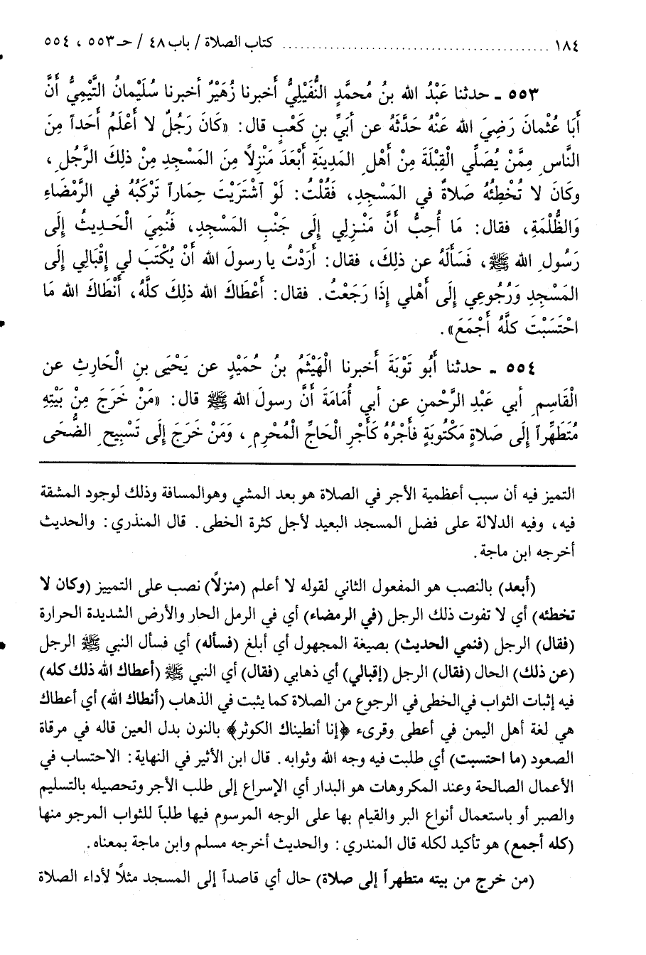 [557] (أَبْعَدَ) بِالنَّصْبِ هُوَ الْمَفْعُولُ الثَّانِي لِقَوْلِهِ لا أعلم (منزلا) نصب على التميز (وَكَانَ لَا تُخْطِئُهُ) أَيْ لَا تَفُوتُ ذَلِكَ الرَّجُلَ (فِي الرَّمْضَاءِ) أَيْ فِي الرَّمْلِ الْحَارِّ وَالْأَرْضِ الشَّدِيدَةِ الْحَرَارَةِ (فَقَالَ) الرَّجُلُ (فَنُمِيَ الْحَدِيثُ) بِصِيغَةِ الْمَجْهُولِ أَيْ أُبْلِغَ (فَسَأَلَهُ) أَيْ فَسَأَلَ النَّبِيُّ صَلَّى اللَّهُ عَلَيْهِ وَسَلَّمَ الرَّجُلَ (عَنْ ذَلِكَ) الْحَالِ (فَقَالَ) الرَّجُلُ (إِقْبَالِي) أَيْ ذَهَابِي (فَقَالَ) أَيِ النَّبِيُّ صَلَّى اللَّهُ عَلَيْهِ وَسَلَّمَ (أَعْطَاكَ اللَّهُ ذَلِكَ كُلَّهُ) فِيهِ إِثْبَاتُ الثَّوَابِ في الخطا فِي الرُّجُوعِ مِنَ الصَّلَاةِ كَمَا يَثْبُتُ فِي الذَّهَابِ (أَنْطَاكَ اللَّهُ) أَيْ أَعْطَاكُ هِيَ لُغَةُ أهل اليمن في أعطى وقرىء إِنَّا أَنْطَيْنَاكَ الْكَوْثَرَ بِالنُّونِ بَدَلُ الْعَيْنِ قَالَهُ فِي مِرْقَاةِ الصُّعُودِ (مَا احْتَسَبْتَ) أَيْ طَلَبْتَ فيه وجه الله وثوابه