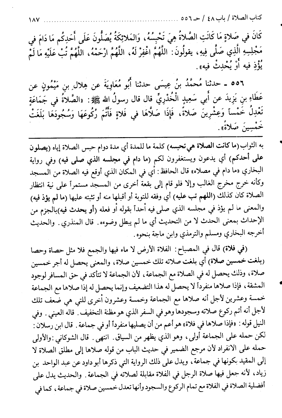 قَالَ الشَّوْكَانِيُّ وَالْأَوْلَى حَمْلُهُ عَلَى الِانْفِرَادِ لِأَنَّ مَرْجِعَ الضَّمِيرِ فِي حَدِيثِ الْبَابِ مِنْ قَوْلِهِ صَلَّاهَا إِلَى مُطْلَقِ الصَّلَاةِ لَا إِلَى الْمُقَيَّدِ بِكَوْنِهَا فِي جَمَاعَةٍ وَيَدُلُّ عَلَى ذَلِكَ الرِّوَايَةُ الَّتِي ذَكَرَهَا أَبُو دَاوُدَ عَنْ عَبْدِ الْوَاحِدِ بْنِ زِيَادٍ لِأَنَّهُ جَعَلَ فِيهَا صَلَاةَ الرَّجُلِ فِي الْفَلَاةِ مُقَابِلَةً لِصَلَاتِهِ فِي الْجَمَاعَةِ