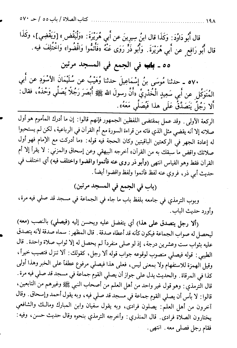 [574] وَبَوَّبَ التِّرْمِذِيُّ فِي جَامِعِهِ بِلَفْظِ بَابِ مَا جَاءَ فِي الْجَمَاعَةِ فِي مَسْجِدٍ قَدْ صَلَّى فِيهِ مَرَّةً وَأَوْرَدَ حَدِيثَ الْبَابِ