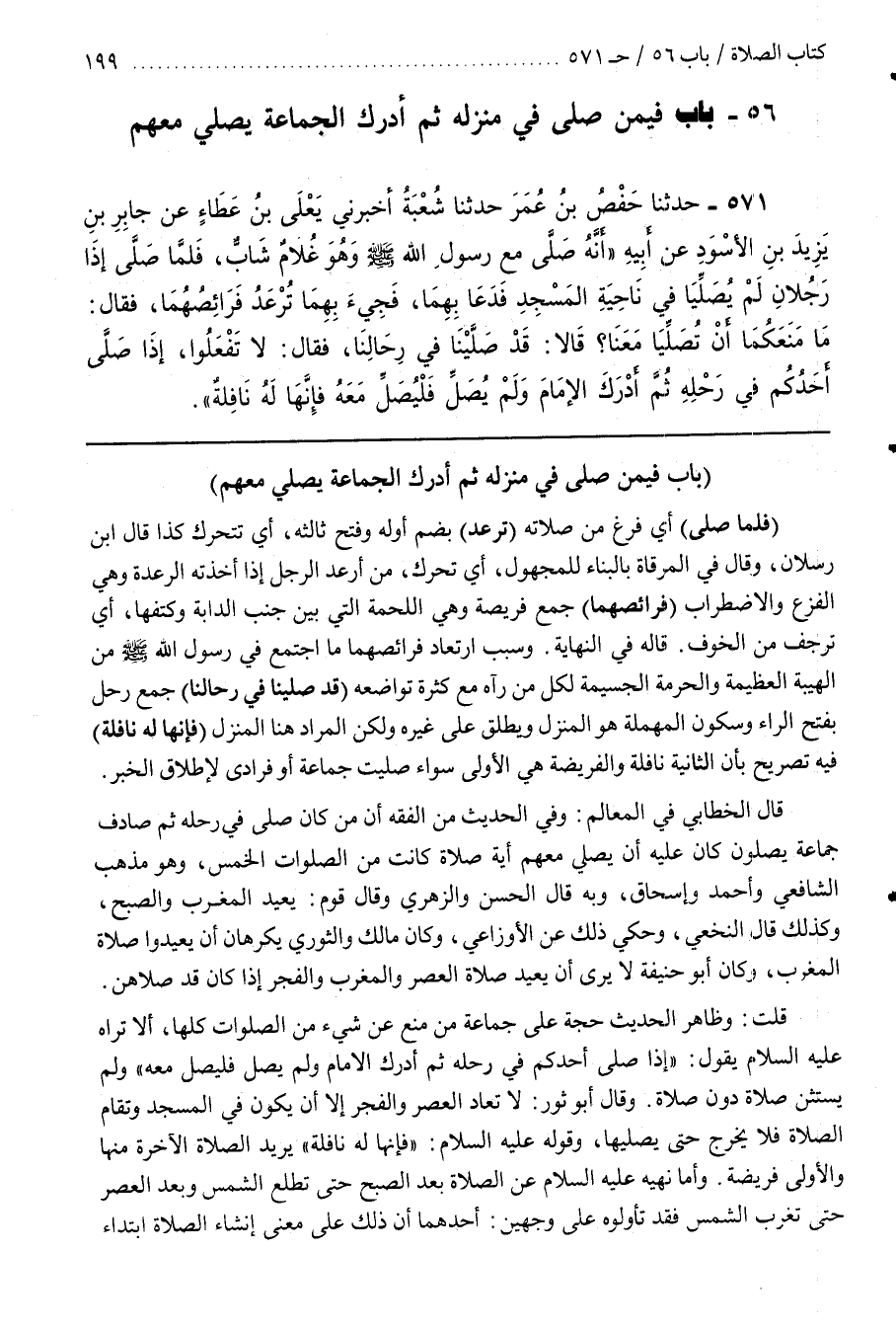 قَالَ الْخَطَّابِيُّ فِي الْمَعَالِمِ وَفِي الْحَدِيثِ مِنَ الْفِقْهِ إِنَّ مَنْ كَانَ صَلَّى فِي رَحْلِهِ ثُمَّ صَادَفَ جَمَاعَةً يُصَلُّونَ كَانَ عَلَيْهِ أَنْ يُصَلِّيَ مَعَهُمْ أَيَّةَ صَلَاةٍ كَانَتْ مِنْ صَلَوَاتِ الْخَمْسِ وَهُوَ مَذْهَبُ الشَّافِعِيِّ وَأَحْمَدَ وَإِسْحَاقَ وَبِهِ قَالَ الْحَسَنُ وَالزُّهْرِيُّ