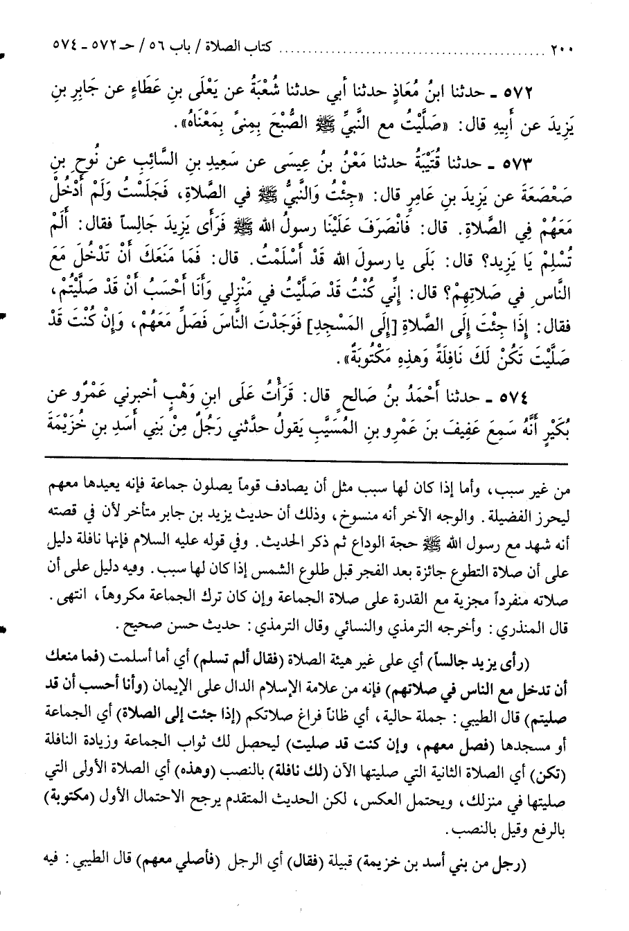 [577] (رَأَى يَزِيدُ جَالِسًا) أَيْ عَلَى غَيْرِ هَيْئَةِ الصَّلَاةِ (فَقَالَ أَلَمْ تُسْلِمْ) أَيْ أَمَا أَسْلَمْتَ (فَمَا مَنَعَكَ أَنْ تَدْخُلَ مَعَ النَّاسِ فِي صَلَاتِهِمْ) فَإِنَّهُ مِنْ عَلَامَةِ الْإِسْلَامِ الدَّالُّ عَلَى الْإِيمَانِ (وَأَنَا أَحْسِبُ أَنْ قَدْ صَلَّيْتُمْ) قَالَ الطِّيبِيُّ جُمْلَةٌ حَالِيَّةٌ أَيْ ظَانًّا فَرَاغَ صَلَاتِكُمْ (إِذَا جِئْتَ إِلَى الصَّلَاةِ) أَيِ الْجَمَاعَةِ أَوْ مَسْجِدِهَا (فَصَلِّ مَعَهُمْ وَإِنْ كُنْتَ قَدْ صَلَّيْتَ) لِيَحْصُلَ لَكَ ثَوَابُ الْجَمَاعَةِ وَزِيَادَةُ النَّافِلَةِ (تَكُنْ) أَيِ الصَّلَاةُ الثَّانِيَةُ الَّتِي صَلَّيْتَهَا الْآنَ (لَكَ نَافِلَةً) بِالنَّصْبِ (وَهَذِهِ) أَيِ الصَّلَاةُ الْأُولَى الَّتِي صَلَّيْتَهَا فِي مَنْزِلِكَ وَيَحْتَمِلُ الْعَكْسَ لَكِنِ الْحَدِيثُ الْمُتَقَدِّمُ يُرَجِّحُ الِاحْتِمَالَ الْأَوَّلَ (مَكْتُوبَةٌ) بِالرَّفْعِ وَقِيلَ بِالنَّصْبِ