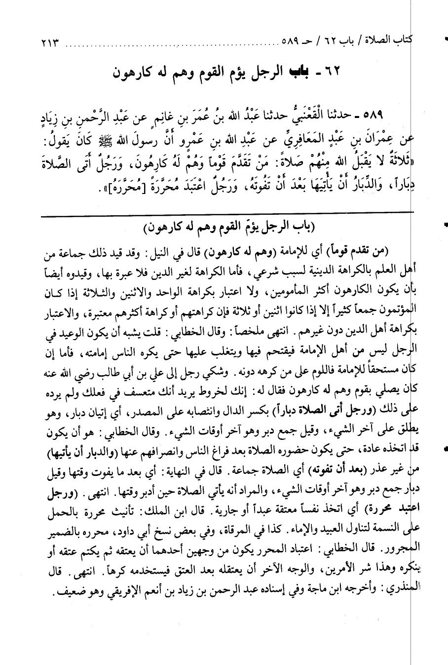 [593] (مَنْ تَقَدَّمَ قَوْمًا) أَيْ لِلْإِمَامَةِ (وَهُمْ لَهُ كَارِهُونَ) قَالَ فِي النَّيْلِ وَقَدْ قَيَّدَ ذَلِكَ جَمَاعَةٌ مِنْ أَهْلِ الْعِلْمِ بِالْكَرَاهِيَةِ الدِّينِيَّةِ لِسَبَبٍ شَرْعِيٍّ فَأَمَّا الْكَرَاهَةُ لِغَيْرِ الدِّينِ فَلَا عِبْرَةَ بِهَا وَقَيَّدُوهُ أَيْضًا بِأَنْ يَكُونَ الْكَارِهُونَ أَكْثَرُ الْمَأْمُومِينَ وَلَا اعْتِبَارَ بِكَرَاهَةِ الْوَاحِدِ وَالِاثْنَيْنِ وَالثَّلَاثَةِ إِذَا كَانَ الْمُؤْتَمُّونَ جَمْعًا كَثِيرًا إِلَّا إِذَا كَانُوا اثْنَيْنِ أَوْ ثَلَاثَةً فَإِنَّ كَرَاهَتَهُمْ أَوْ كَرَاهَةَ أَكْثَرِهِمْ مُعْتَبَرَةٌ وَالِاعْتِبَارُ بِكَرَاهَةِ أَهْلِ الدِّينِ دُونَ غَيْرِهِمُ