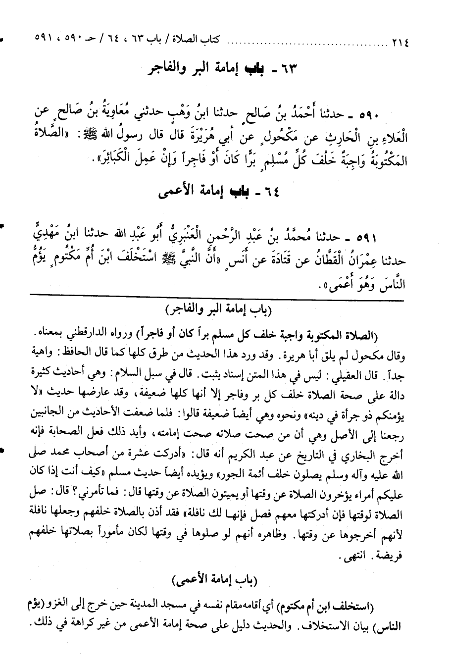 وَقَدْ وَرَدَ هَذَا الْحَدِيثُ مِنْ طُرُقٍ كُلِّهَا كَمَا قَالَ الْحَافِظُ وَاهِيَةٌ جِدًّا قَالَ الْعُقَيْلِيُّ لَيْسَ فِي هَذَا الْمَتْنِ إِسْنَادٌ يَثْبُتُ وَقَالَ فِي سُبُلِ السَّلَامِ وَهِيَ أَحَادِيثُ كَثِيرَةٌ دَالَّةٌ عَلَى صِحَّةِ الصَّلَاةِ خَلْفَ كُلِّ بَرٍّ وَفَاجِرٍ إِلَّا أَنَّهَا كُلَّهَا ضَعِيفَةٌ وَقَدْ عَارَضَهَا حَدِيثُ لَا يَؤُمَّنَّكُمْ ذُو جُرْأَةٍ فِي دِينِهِ وَنَحْوُهُ وَهِيَ أَيْضًا ضَعِيفَةٌ قَالُوا فَلَمَّا ضَعُفَتِ الْأَحَادِيثُ مِنَ الْجَانِبَيْنِ رَجَعْنَا إِلَى الْأَصْلِ وَهِيَ أَنَّ مَنْ صَحَّتْ صَلَاتُهُ صَحَّتْ إِمَامَتُهُ وَأَيَّدَ ذَلِكَ فِعْلُ الصَّحَابَةِ فَإِنَّهُ أَخْرَجَ الْبُخَارِيُّ فِي التَّارِيخِ عَنْ عَبْدِ الْكَرِيمِ أَنَّهُ قَالَ أدركت عشرة من أصحاب محمد صلىالله عَلَيْهِ وَآلِهِ وَسَلَّمَ يُصَلُّونَ خَلْفَ أَئِمَّةِ الْجَوْرِ وَيُؤَيِّدُهُ أَيْضًا حَدِيثُ مُسْلِمٍ كَيْفَ أَنْتَ إِذَا كَانَ عَلَيْكُمْ أُمَرَاءٌ يُؤَخِّرُونَ الصَّلَاةَ عَنْ وَقْتِهَا أَوْ يُمِيتُونَ الصَّلَاةَ عَنْ وَقْتِهَا قَالَ فَمَا تَأْمُرُنِي قَالَ صَلِّ الصَّلَاةَ لِوَقْتِهَا فَإِنْ أَدْرَكْتَهَا مَعَهُمْ فَصَلِّ فَإِنَّهَا لَكَ نَافِلَةٌ فَقَدْ أَذِنَ بِالصَّلَاةِ خَلْفَهُمْ وَجَعَلَهَا نَافِلَةً لِأَنَّهُمْ أَخْرَجُوهَا عَنْ وَقْتِهَا