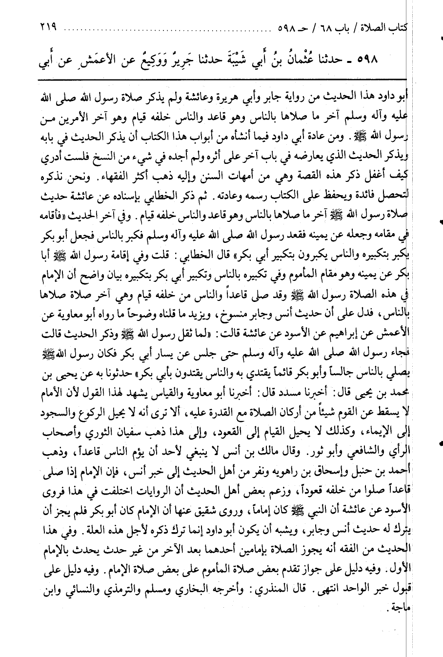 وَفِي آخِرِ الْحَدِيثِ فَأَقَامَهُ فِي مَقَامِهِ وَجَعَلَهُ عَنْ يَمِينِهِ فَقَعَدَ رَسُولُ اللَّهِ صَلَّى اللَّهُ عَلَيْهِ وَسَلَّمَ فكبر بالناس فجلع أَبُو بَكْرٍ يُكَبِّرُ بِتَكْبِيرِهِ وَالنَّاسُ يُكَبِّرُونَ بِتَكْبِيرِ أَبِي بَكْرٍ قَالَ الْخَطَّابِيُّ قُلْتُ وَفِي إِقَامَةِ رَسُولِ اللَّهِ صَلَّى اللَّهُ عَلَيْهِ وَسَلَّمَ أَبَا بَكْرٍ عَنْ يَمِينِهِ وَهُوَ مَقَامُ الْمَأْمُومِ وَفِي تَكْبِيرِهِ بِالنَّاسِ وَتَكْبِيرُ أَبِي بَكْرٍ بِتَكْبِيرِهِ بَيَانٌ وَاضِحٌ أَنَّ الْإِمَامَ فِي هَذِهِ الصَّلَاةِ رَسُولُ اللَّهِ صَلَّى اللَّهُ عَلَيْهِ وَسَلَّمَ وَقَدْ صَلَّى قَاعِدًا وَالنَّاسُ مِنْ خَلْفِهِ قِيَامٌ وَهِيَ آخِرُ صَلَاةٍ صَلَّاهَا بِالنَّاسِ فَدَلَّ عَلَى أَنَّ حَدِيثَ أَنَسٍ وَجَابِرٍ مَنْسُوخٌ وَيَزِيدُ مَا قُلْنَاهُ وُضُوحًا مَا رَوَاهُ أَبُو مُعَاوِيَةَ عَنِ الْأَعْمَشِ عَنْ إِبْرَاهِيمَ عَنِ الْأَسْوَدِ عَنْ عَائِشَةَ قَالَتْ لَمَّا ثَقُلَ رَسُولُ اللَّهِ صَلَّى اللَّهُ عَلَيْهِ وَسَلَّمَ وَذَكَرَ الْحَدِيثَ قَالَتْ فَجَاءَ رَسُولُ اللَّهِ صَلَّى الله عليه وَسَلَّمَ حَتَّى جَلَسَ عَنْ يَسَارِ أَبِي بَكْرٍ فَكَانَ رَسُولُ اللَّهِ صَلَّى اللَّهُ عَلَيْهِ وَسَلَّمَ يُصَلِّي بِالنَّاسِ جَالِسًا وَأَبُو بَكْرٍ قَائِمًا يَقْتَدِي بِهِ وَالنَّاسُ يَقْتَدُونَ بِأَبِي بَكْرٍ حَدَّثُونَا بِهِ عَنْ يَحْيَى بْنِ مُحَمَّدِ بْنِ يَحْيَى قَالَ أَخْبَرَنَا مُسَدَّدٌ قَالَ أَخْبَرَنَا أَبُو مُعَاوِيَةَ وَالْقِيَاسُ يَشْهَدُ لِهَذَا الْقَوْلِ لِأَنَّ الْإِمَامَ لَا يُسْقِطُ عَنِ الْقَوْمِ شَيْئًا مِنْ أَرْكَانِ الصَّلَاةِ مَعَ الْقُدْرَةِ عَلَيْهِ أَلَا تَرَى أَنَّهُ لَا يُحِيلُ الرُّكُوعَ وَالسُّجُودَ إِلَى الْإِيمَاءِ وَكَذَلِكَ لَا يُحِيلُ القيام إلى القعود وإلى ذَهَبَ سُفْيَانُ الثَّوْرِيُّ وَأَصْحَابُ الرَّأْيِ وَالشَّافِعِيُّ وَأَبُو ثَوْرٍ