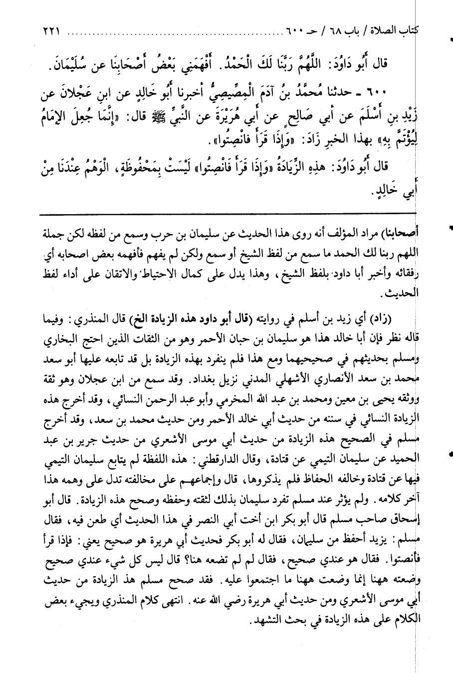 [604] (زَادَ) أَيْ زَيْدُ بْنُ أَسْلَمَ فِي رِوَايَتِهِ (قَالَ أَبُو دَاوُدَ هَذِهِ الزِّيَادَةُ إِلَخْ) قَالَ الْمُنْذِرِيُّ وَفِيمَا قَالَهُ نَظَرٌ فَإِنَّ أَبَا خَالِدٍ هَذَا هُوَ سُلَيْمَانُ بْنُ حِبَّانَ الْأَحْمَرُ وَهُوَ مِنَ الثِّقَاتِ الَّذِينَ احْتَجَّ الْبُخَارِيُّ وَمُسْلِمٌ بِحَدِيثِهِمْ فِي صَحِيحَيْهِمَا وَمَعَ هَذَا فَلَمْ يَنْفَرِدْ بِهَذِهِ الزِّيَادَةِ بَلْ قَدْ تَابَعَهُ عَلَيْهَا أَبُو سَعْدٍ مُحَمَّدُ بْنُ سَعْدٍ الْأَنْصَارِيُّ الْأَشْهَلِيُّ الْمَدَنِيُّ نزيل بغداد وقد سمع من بن عَجْلَانٍ وَهُوَ ثِقَةٌ وَوَثَّقَهُ يَحْيَى بْنُ مَعِينٍ وَمُحَمَّدُ بْنُ عَبْدِ اللَّهِ الْمَخْرَمِيُّ وَأَبُو عَبْدِ الرَّحْمَنِ النَّسَائِيُّ وَقَدْ أَخْرَجَ هَذِهِ الزِّيَادَةِ النَّسَائِيُّ في سننه من النسائي أَبِي خَالِدٍ الْأَحْمَرِ وَمِنْ حَدِيثِ مُحَمَّدِ بْنِ سَعْدٍ وَقَدْ أَخْرَجَ مُسْلِمٌ فِي الصَّحِيحِ هَذِهِ الزِّيَادَةَ مِنْ حَدِيثِ أَبِي مُوسَى الْأَشْعَرِيِّ مِنْ حَدِيثِ جَرِيرِ بْنِ عَبْدِ الْحَمِيدِ عَنْ سُلَيْمَانَ التَّيْمِيِّ عَنْ قَتَادَةَ وَقَالَ الدَّارَقُطْنِيُّ هَذِهِ اللَّفْظَةُ لَمْ يُتَابَعْ سُلَيْمَانُ التَّيْمِيُّ فِيهَا عَنْ قَتَادَةَ وَخَالَفَهُ الْحُفَّاظُ فَلَمْ يَذْكُرُوهَا قَالَ وَإِجْمَاعُهُمْ عَلَى مخالفة تَدُلُّ عَلَى وَهْمِهِ هَذَا آخِرُ كَلَامِهِ