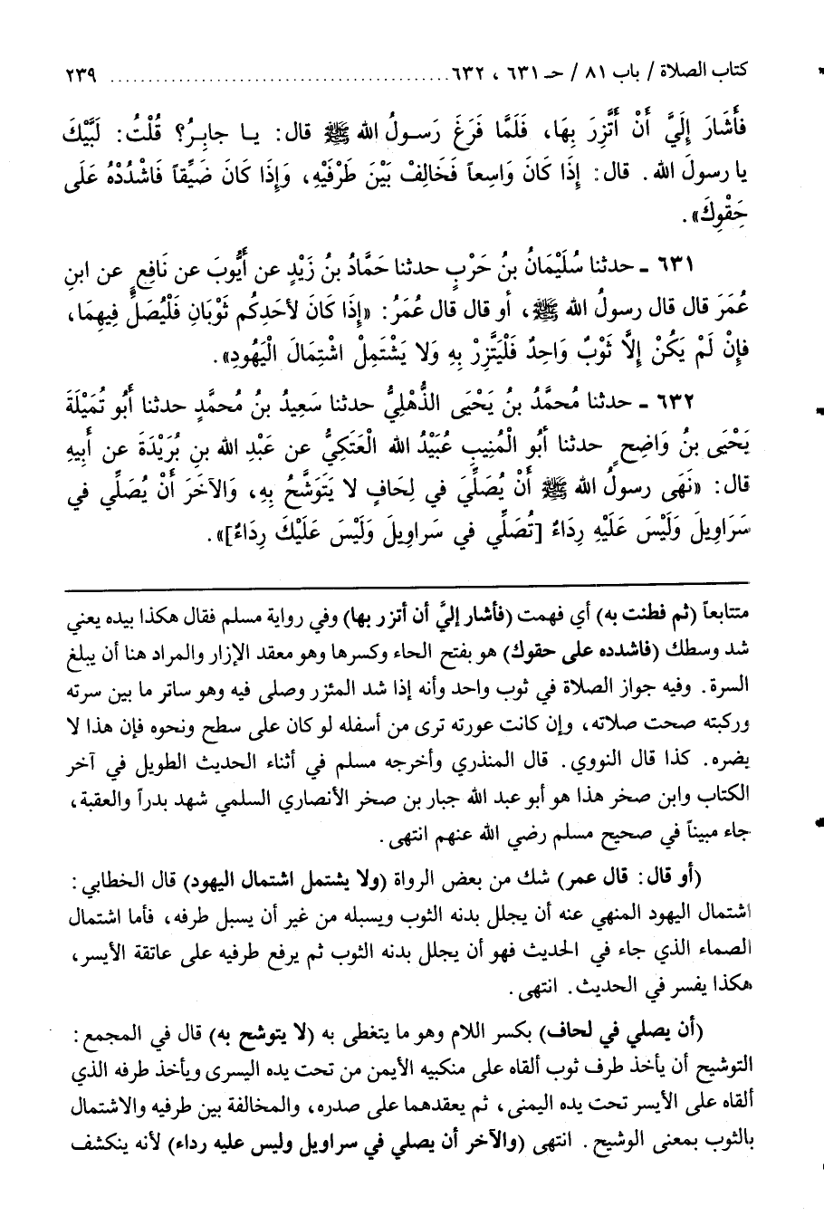 [635] (أَوْ قَالَ قَالَ عُمَرُ) شَكٌّ مِنْ بَعْضِ الرُّوَاةِ (وَلَا يَشْتَمِلِ اشْتِمَالَ الْيَهُودِ) قَالَ الْخَطَّابِيُّ اشْتِمَالُ الْيَهُودِ الْمَنْهِيُّ عَنْهُ أَنْ يُجَلِّلَ بَدَنُهُ الثَّوْبَ وَيُسْبِلَهُ مِنْ غَيْرِ أَنْ يُسْبِلَ طَرَفَهُ فَأَمَّا اشْتِمَالُ الصَّمَّاءِ الَّذِي جَاءَ فِي الْحَدِيثِ فَهُوَ أَنْ يُجَلِّلَ بَدَنُهُ الثَّوْبَ ثُمَّ يَرْفَعُ طَرَفَيْهِ عَلَى عَاتِقِهِ الْأَيْسَرِ هَكَذَا يُفَسَّرُ فِي الْحَدِيثِ