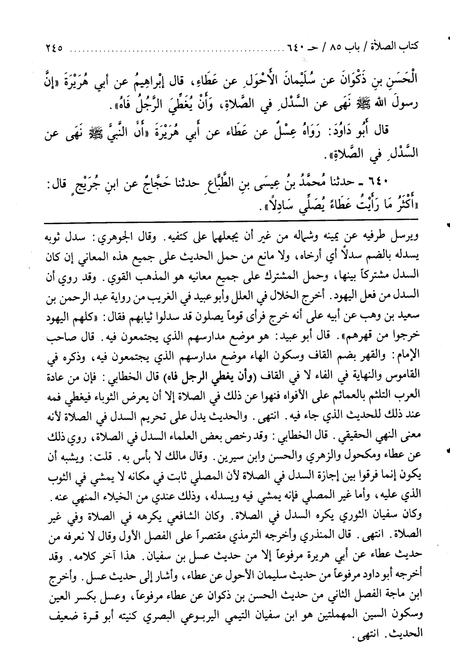 قَالَ الْخَطَّابِيُّ وَقَدْ رَخَّصَ بَعْضُ الْعُلَمَاءِ السَّدْلَ فِي الصَّلَاةِ رُوِيَ ذَلِكَ عَنْ عَطَاءٌ وَمَكْحُولٍ وَالزُّهْرِيِّ والحسن وبن سِيرِينَ