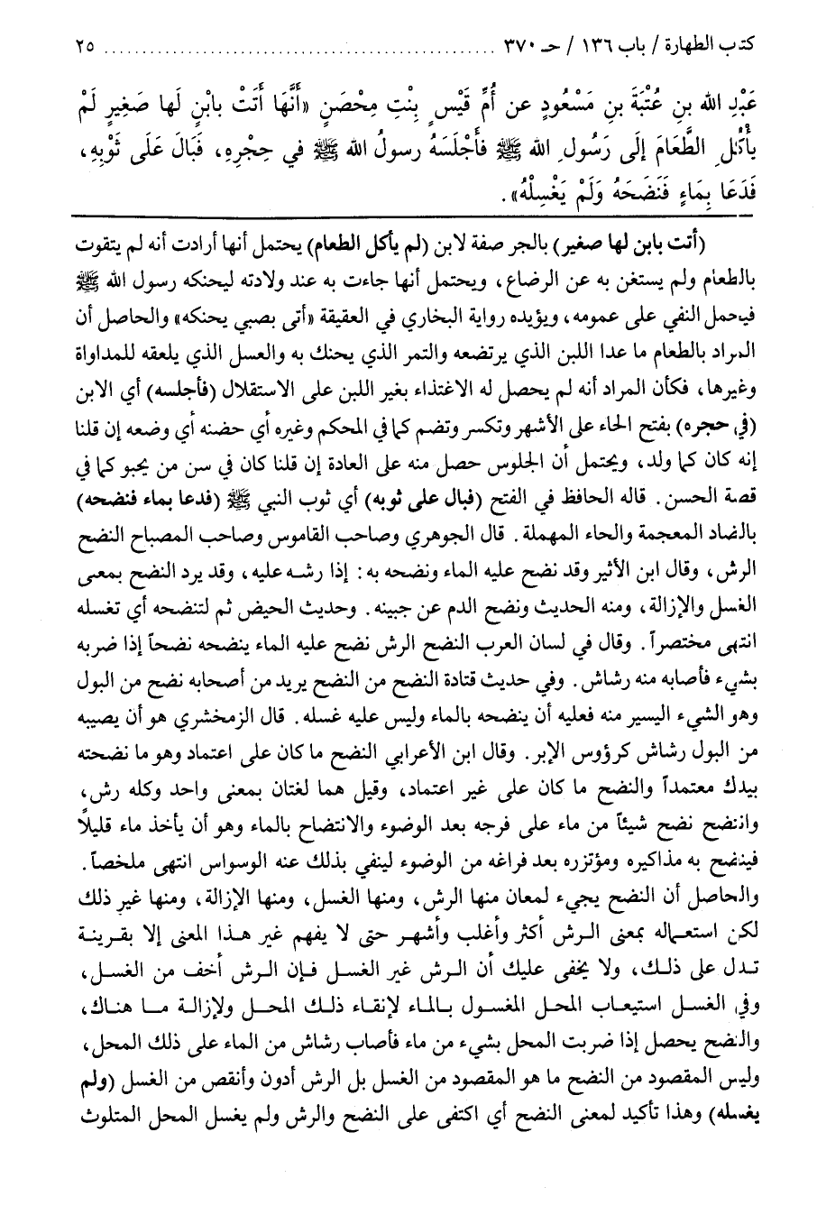 قَالَ الْجَوْهَرِيُّ وَصَاحِبُ الْقَامُوسِ وصاحب المصباح النضح الرش وقال بن الْأَثِيرِ وَقَدْ نَضَحَ عَلَيْهِ الْمَاءَ وَنَضَحَهُ بِهِ إِذَا رَشَّهُ عَلَيْهِ وَقَدْ يَرِدُ النَّضْحُ بِمَعْنَى الْغَسْلِ وَالْإِزَالَةِ وَمِنْهُ الْحَدِيثُ وَنَضَحَ الدَّمَ عَنْ جَبِينِهِ