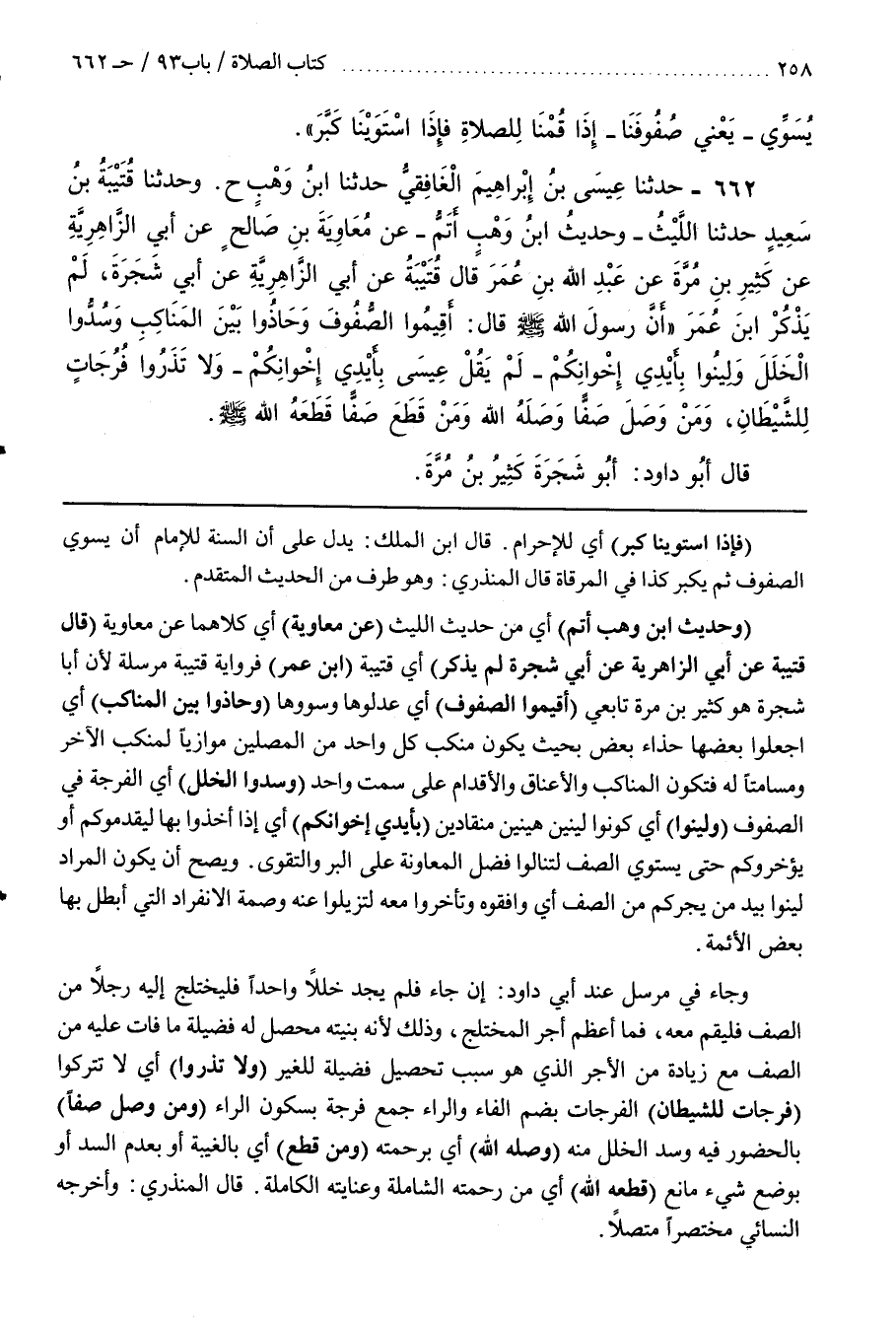 [666] (وحديث بن وَهْبٍ أَتَمُّ) أَيْ مِنْ حَدِيثِ اللَّيْثِ (عَنْ مُعَاوِيَةَ) أَيْ كِلَاهُمَا عَنْ مُعَاوِيَةَ (قَالَ قُتَيْبَةُ عَنْ أَبِي الزَّاهِرِيَّةَ عَنْ أَبَى شَجَرَةَ لَمْ يذكر) أي قتيبة (بن عُمَرَ) فَرِوَايَةُ قُتَيْبَةَ مُرْسَلَةٌ لِأَنَّ أَبَا شَجَرَةَ هُوَ كَثِيرُ بْنُ مَرَّةَ تَابِعِيٌّ (أَقِيمُوا الصُّفُوفَ) أَيْ عَدِّلُوهَا وَسَوُّوهَا (وَحَاذُوا بَيْنَ الْمَنَاكِبِ) أَيِ اجْعَلُوا بَعْضَهَا حِذَاءَ بَعْضٍ بِحَيْثُ يَكُونُ مَنْكِبُ كُلِّ وَاحِدٍ مِنَ الْمُصَلِّينَ مُوَازِيًا لِمَنْكِبِ الْآخَرِ وَمُسَامِتًا لَهُ فَتَكُونَ الْمَنَاكِبُ وَالْأَعْنَاقُ وَالْأَقْدَامُ عَلَى سَمْتٍ وَاحِدٍ (وَسُدُّوا الْخَلَلَ) أَيِ الْفُرْجَةَ فِي الصُّفُوفِ (وَلِينُوا) أَيْ كُونُوا لَيِّنِينَ هَيِّنِينَ مُنْقَادِينَ (بِأَيْدِي إِخْوَانِكُمْ) أَيْ إِذَا أَخَذُوا بِهَا لِيُقَدِّمُوكُمْ أَوْ يُؤَخِّرُوكُمْ حَتَّى يَسْتَوِيَ الصَّفُّ لِتَنَالُوا فَضْلَ الْمُعَاوَنَةِ عَلَى الْبِرِّ وَالتَّقْوَى