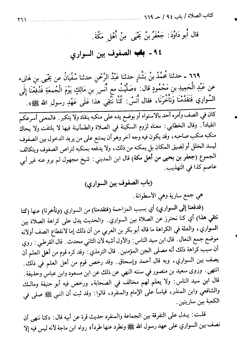 وَقَالَ الْخَطَّابِيُّ مَعْنَاهُ لُزُومُ السَّكِينَةِ فِي الصَّلَاةِ وَالطُّمَأْنِينَةِ فِيهَا لَا يَلْتَفِتَ وَلَا يُحَاكُّ مَنْكِبُهُ مَنْكِبَ صَاحِبِهِ وَقَدْ يَكُونُ فِيهِ وَجْهٌ آخَرُ وَهُوَ أَنْ لَا يَمْتَنِعَ عَلَى مَنْ يُرِيدُ الدُّخُولَ بَيْنَ الصُّفُوفِ لِيَسُدَّ الْخَلَلَ أَوْ لِضِيقِ الْمَكَانِ بَلْ يُمَكِّنُهُ مِنْ ذلك ولا يدفعه بمنكبه لتراص الصفوف ويتكاتف الْجُمُوعِ (جَعْفَرُ بْنُ يَحْيَى مِنْ أَهْلُ مَكَّةَ) قال بن الْمَدِينِيِّ شَيْخٌ مَجْهُولٌ لَمْ يَرْوِ عَنْهُ غَيْرُ أَبِي عَاصِمٍ كَذَا فِي التَّهْذِيبِ