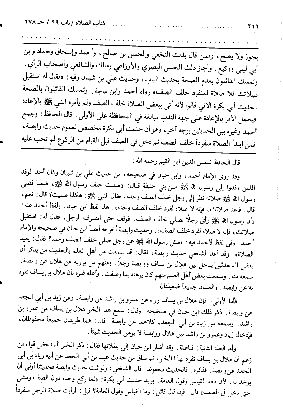 ــــــــــــQقال الحافظ شمس الدين بن القيم رحمه الله وقد روى الإمام أحمد وبن حِبَّانَ فِي صَحِيحه مِنْ حَدِيث عَلِيِّ بْنِ شَيْبَانَ وَكَانَ أَحَد الْوَفْد الَّذِينَ وَفَدُوا إِلَى رسول الله صلى الله عليه وسلم من بَنِي حَنِيفَةَ قَالَ صَلَّيْت خَلْف رَسُول اللَّه صَلَّى اللَّه عَلَيْهِ وَسَلَّمَ فَلَمَّا قَضَى رَسُول اللَّه صَلَّى اللَّه عَلَيْهِ وَسَلَّمَ صَلَاته نَظَرَ إِلَى رَجُل خَلْف الصَّفّ وَحْده فَقَالَ النَّبِيّ صَلَّى اللَّه عَلَيْهِ وَسَلَّمَ هَكَذَا صَلَّيْت قَالَ نَعَمْ قَالَ فَأَعِدْ صَلَاتك فَإِنَّهُ لَا صَلَاة لفرد خلف الصف وحده