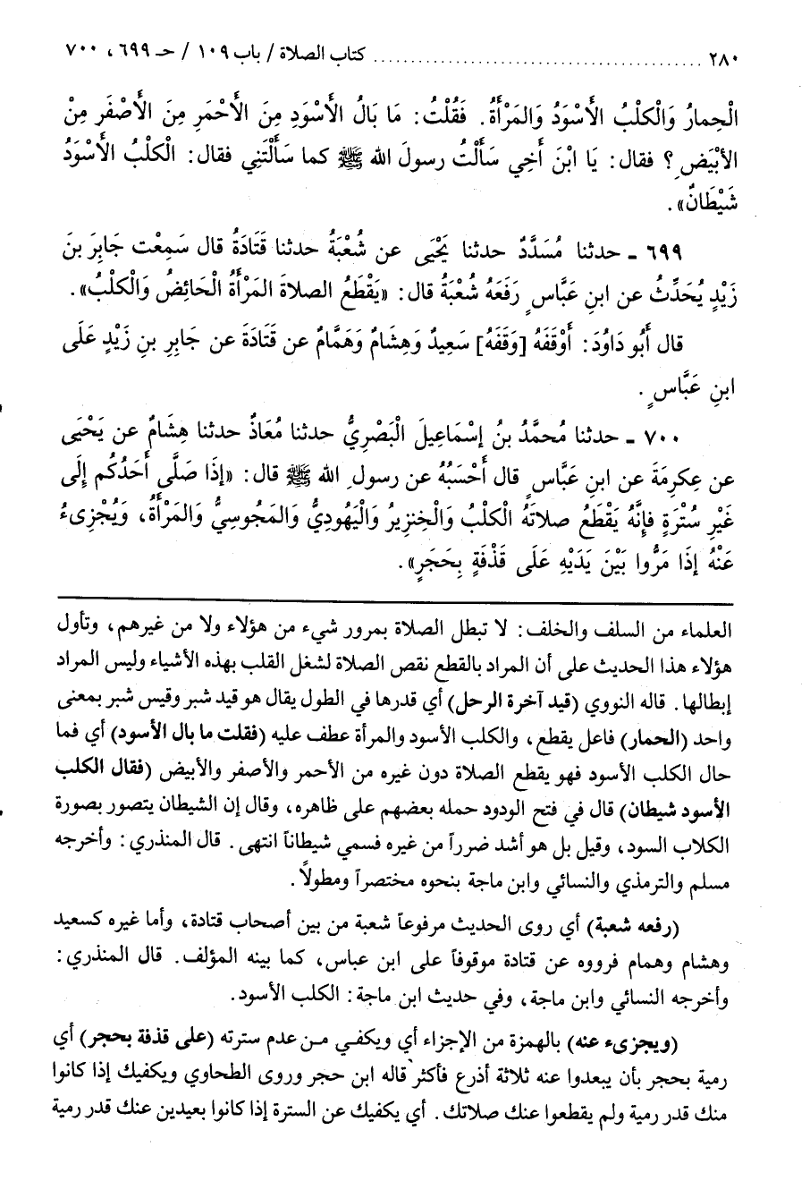 الْعُلَمَاءِ مِنَ السَّلَفِ وَالْخَلَفِ لَا تَبْطُلُ الصَّلَاةُ بِمُرُورِ شَيْءٍ مِنْ هَؤُلَاءِ وَلَا مِنْ غَيْرِهِمْ وَتَأَوَّلَ هَؤُلَاءِ هَذَا الْحَدِيثَ عَلَى أَنَّ الْمُرَادَ بِالْقَطْعِ نَقْصُ الصَّلَاةِ لِشُغْلِ الْقَلْبِ بِهَذِهِ الْأَشْيَاءِ وَلَيْسَ الْمُرَادُ إِبْطَالَهَا