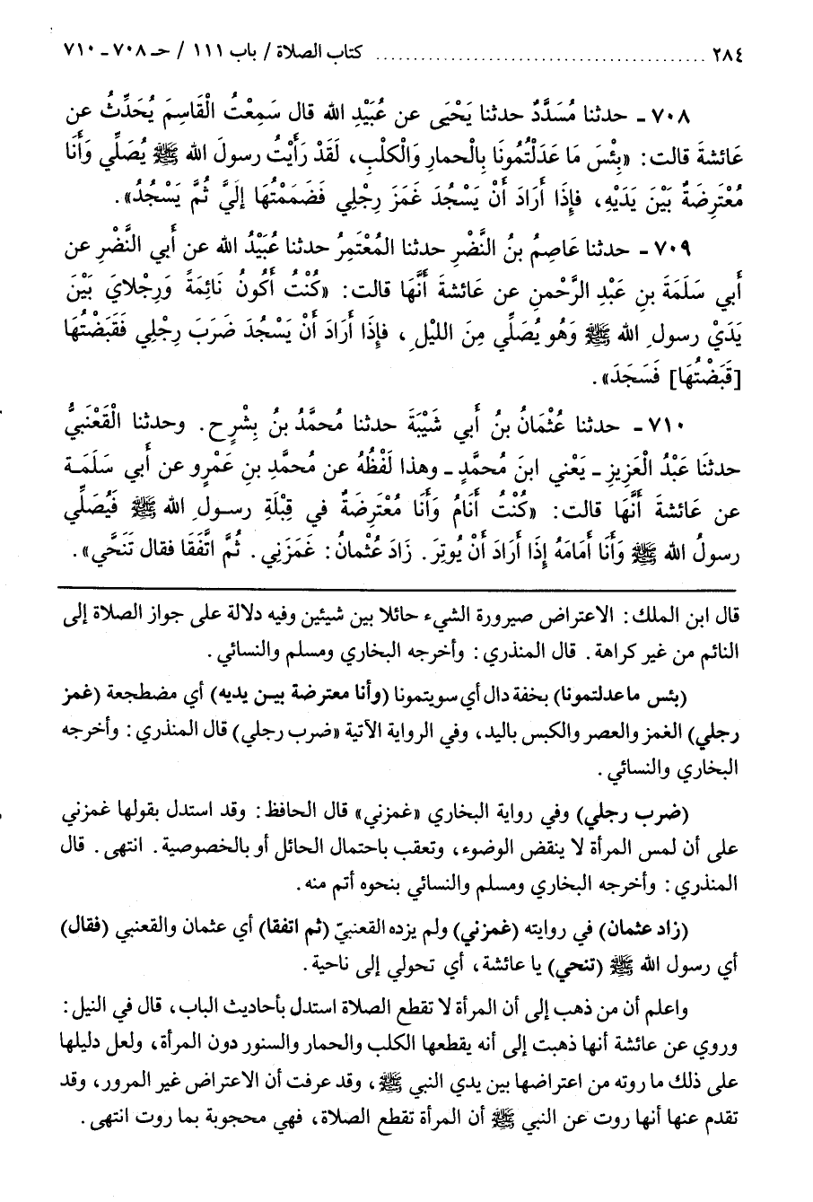[712] (بِئْسَمَا عَدَلْتُمُونَا) بِخِفَّةِ دَالٍ أَيْ سَوَّيْتُمُونَا (وَأَنَا مُعْتَرِضَةٌ بَيْنَ يَدَيْهِ) أَيْ مُضْطَجِعَةٌ (غَمَزَ رِجْلِي) الْغَمْزُ وَالْعَصْرُ وَالْكَبْسُ بِالْيَدِ وَفِي الرِّوَايَةِ الْآتِيَةِ ضَرَبَ رِجْلِي قَالَ الْمُنْذِرِيُّ وَأَخْرَجَهُ الْبُخَارِيُّ وَالنَّسَائِيُّ