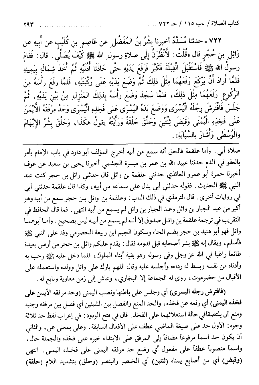 [726] (فَافْتَرَشَ رِجْلَهُ الْيُسْرَى) أَيْ وَجَلَسَ عَلَى بَاطِنِهَا وَنَصَبَ الْيُمْنَى (وَحَدَّ مِرْفَقَهُ الْأَيْمَنَ عَلَى فَخِذِهِ الْيُمْنَى) أَيْ رَفَعَهُ عَنْ فَخِذِهِ وَالْحَدُّ الْمَنْعُ وَالْفَصْلُ بَيْنَ الشَّيْئَيْنِ أَيْ فَصَلَ بَيْنَ مِرْفَقِهِ وَجَنْبِهِ وَمَنَعَ أَنْ يَلْتَصِقَا فِي حَالَةِ اسْتِعْلَائِهِمَا عَلَى الْفَخِذِ