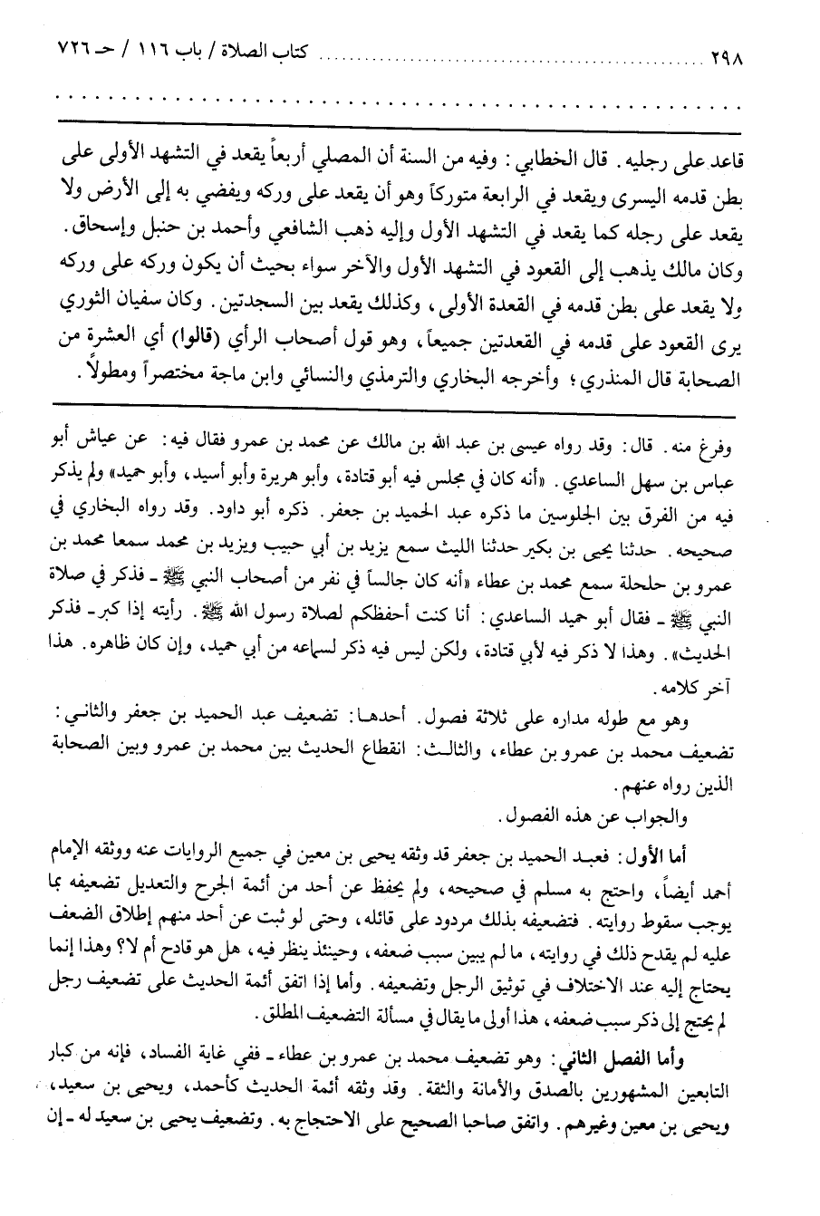 أنه كان في مجلس فِيهِ أَبُو قَتَادَةَ وَأَبُو هُرَيْرَةَ وَأَبُو أَسِيدٍ وَأَبُو حُمَيْدٍ وَلَمْ يَذْكُر فِيهِ مِنْ الْفَرْق بَيْن الْجُلُوسَيْنِ مَا ذَكَرَهُ عَبْدُ الْحَمِيدِ بْنُ جَعْفَرٍ