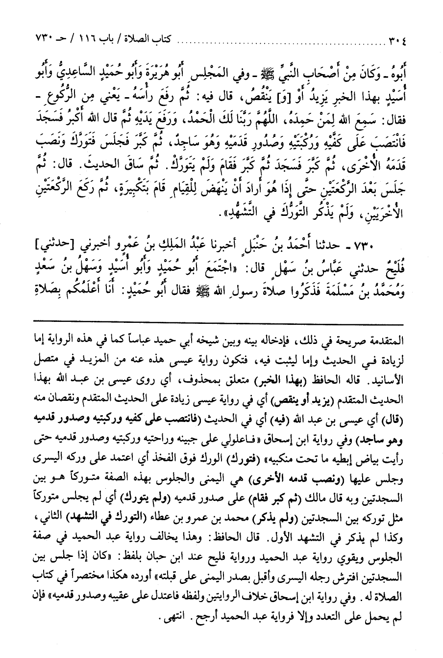 قَالَ الْحَافِظُ وَهَذَا يُخَالِفُ رِوَايَةِ عَبْدِ الْحَمِيدِ فِي صِفَةِ الْجُلُوسِ وَيُقَوِّي رِوَايَةَ عبد الحميد ورواية فليح عند بن حِبَّانَ بِلَفْظِ كَانَ إِذَا جَلَسَ بَيْنَ السَّجْدَتَيْنِ افْتَرَشَ رِجْلَهُ الْيُسْرَى وَأَقْبَلَ بِصَدْرِ الْيُمْنَى عَلَى قِبْلَتِهِ أَوْرَدَهُ هَكَذَا مُخْتَصَرًا فِي كِتَابِ الصَّلَاةِ له