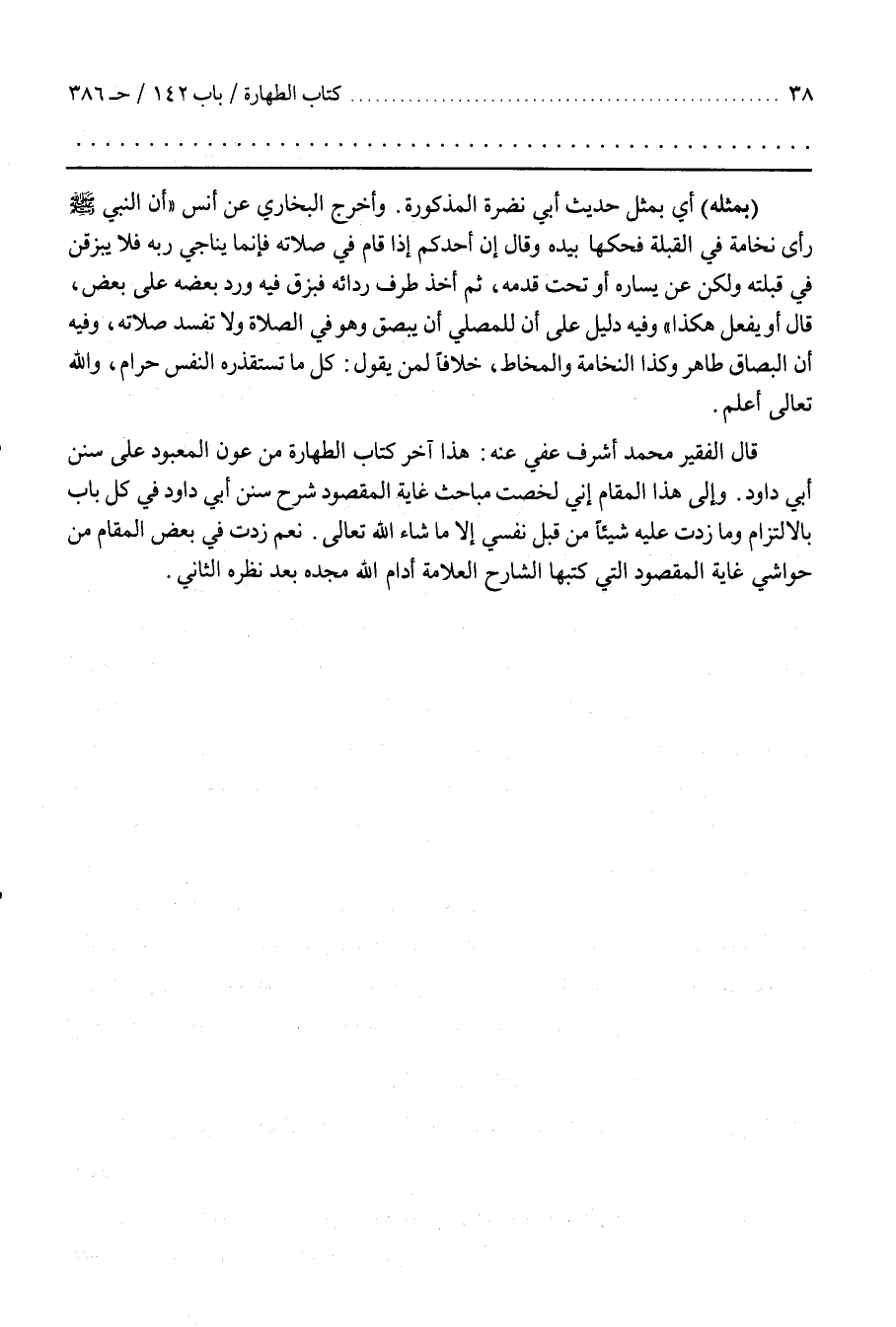 قَالَ الْفَقِيرُ مُحَمَّدٌ أَشْرَفُ عُفِيَ عَنْهُ هَذَا آخِرُ كِتَابِ الطَّهَارَةِ مِنْ عَوْنِ الْمَعْبُودِ عَلَى سُنَنِ أَبِي دَاوُدَ وَإِلَى هَذَا الْمَقَامِ إِنِّي لَخَّصْتُ مَبَاحِثَ غَايَةِ الْمَقْصُودِ شَرْحَ سُنَنِ أَبِي دَاوُدَ فِي كُلِّ باب بالالتزام ومازدت عليه شيئا من قبل نفسي إلا ماشاء اللَّهُ تَعَالَى
