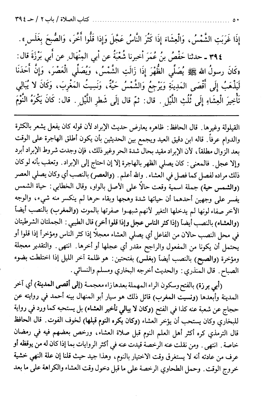 [398] (أَبِي بَرْزَةَ) بِالْفَتْحِ وَسُكُونِ الرَّاءِ الْمُهْمَلَةِ بعدها زاء مُعْجَمَةٌ (إِلَى أَقْصَى الْمَدِينَةِ) أَيْ آخِرِ الْمَدِينَةِ وَأَبْعَدِهَا (وَنَسِيتُ الْمَغْرِبَ) قَائِلُ ذَلِكَ هُوَ سَيَّارٌ أَبُو الْمِنْهَالِ بَيَّنَهُ أَحْمَدُ فِي رِوَايَتِهِ عَنْ حَجَّاجٍ عَنْ شُعْبَةَ عِنْدَ كَذَا فِي الْفَتْحِ (وَكَانَ لَا يُبَالِي تَأْخِيرَ الْعِشَاءِ) بَلْ يَسْتَحِبُّهُ كَمَا وَرَدَ فِي رِوَايَةٍ لِلْبُخَارِيِّ وَكَانَ يَسْتَحِبُّ أَنْ يُؤَخِّرَ الْعِشَاءِ (وَكَانَ يَكْرَهُ النَّوْمَ قَبْلَهَا) لِخَوْفِ الْفَوْتِ