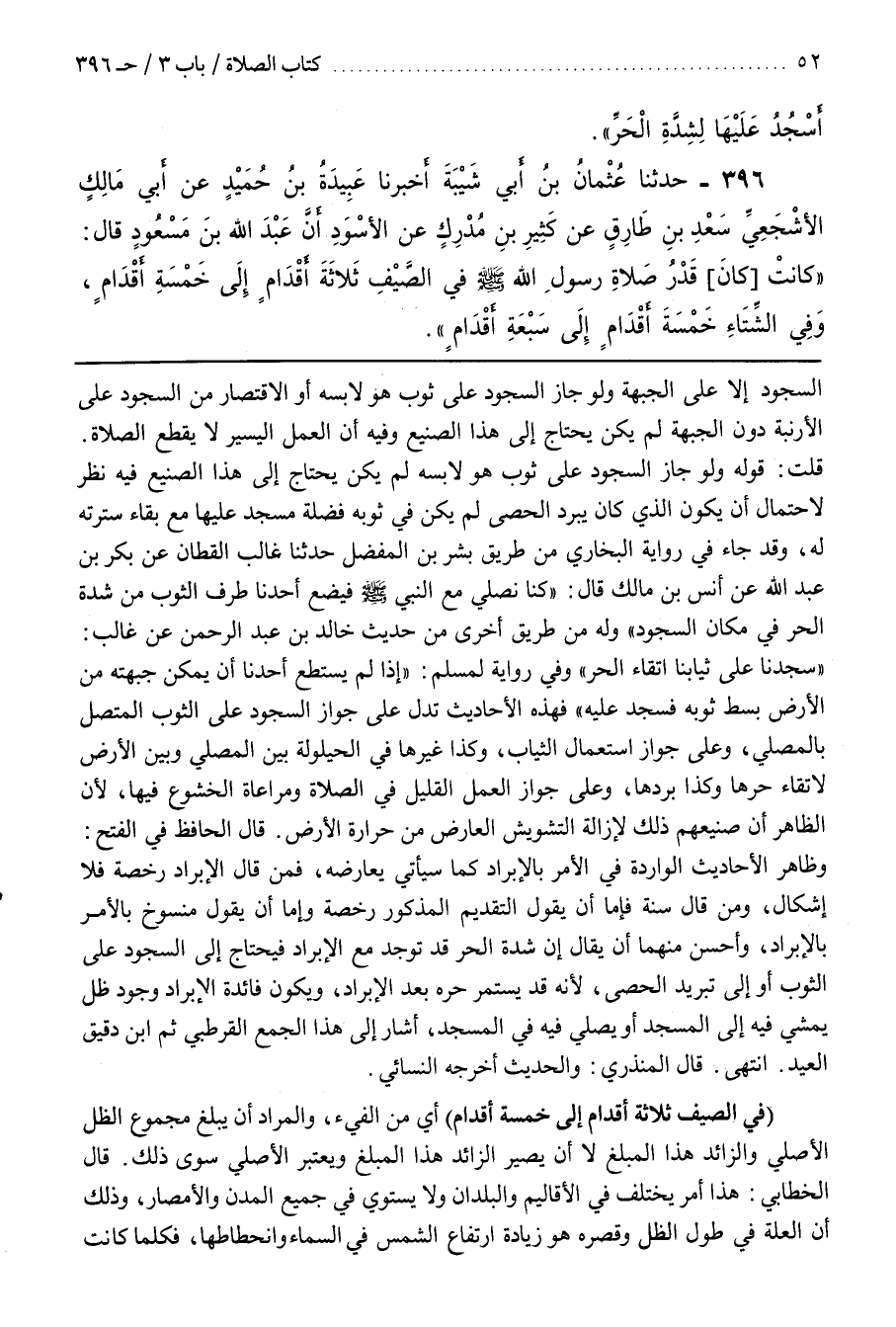 [400] (فِي الصَّيْفِ ثَلَاثَةُ أَقْدَامٍ إِلَى خَمْسَةِ أَقْدَامٍ) أَيْ مِنَ الْفَيْءِ وَالْمُرَادُ أَنْ يَبْلُغَ مَجْمُوعُ الظِّلِّ الْأَصْلِيِّ وَالزَّائِدِ هَذَا الْمَبْلَغَ لَا أَنْ يَصِيرَ الزَّائِدُ هَذَا الْمَبْلَغَ وَيُعْتَبَرُ الْأَصْلِيُّ سِوَى ذَلِكَ