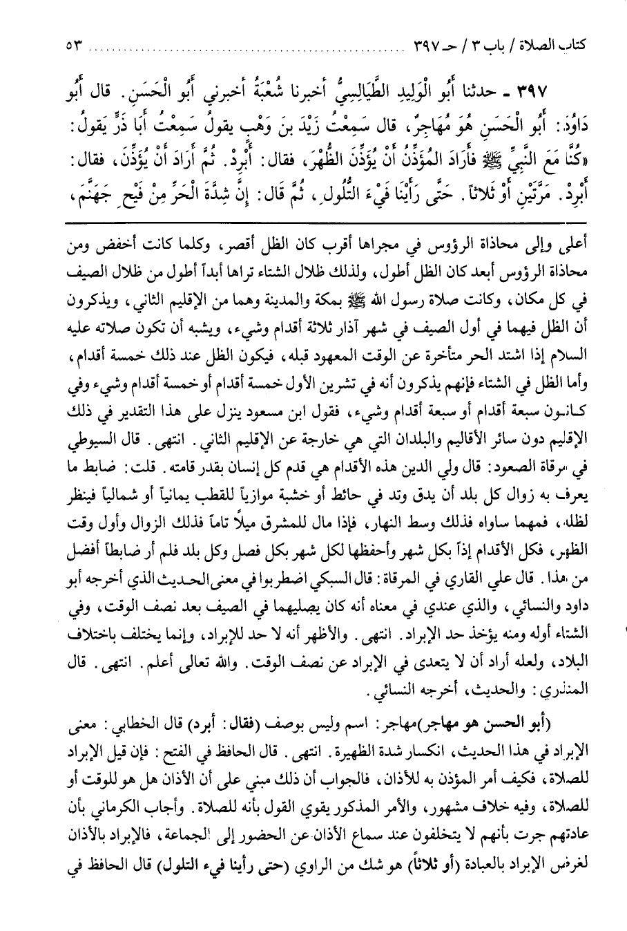 [401] (أَبُو الْحَسَنِ هُوَ مُهَاجِرٌ) مُهَاجِرٌ اسْمٌ وَلَيْسَ بِوَصْفٍ (فَقَالَ أَبْرِدْ) قَالَ الْخَطَّابِيُّ مَعْنَى الْإِبْرَادِ فِي هَذَا الْحَدِيثِ انْكِسَارُ شِدَّةِ الظَّهِيرَةِ