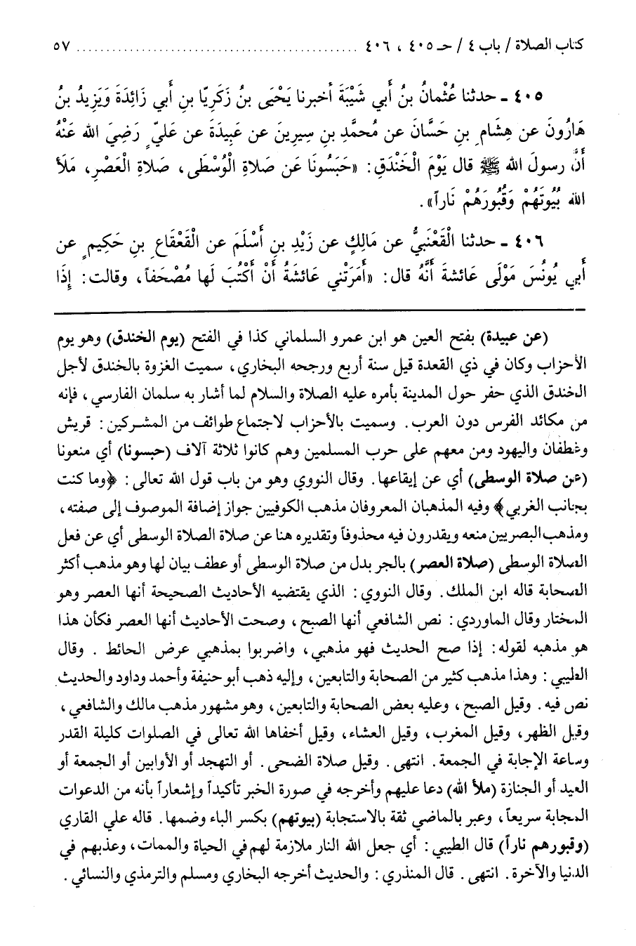 [409] (عن عبيدة) بفتح العين هو بن عَمْرٍو السَّلْمَانِيُّ كَذَا فِي الْفَتْحِ (يَوْمَ الْخَنْدَقِ) وَهُوَ يَوْمُ الْأَحْزَابِ وَكَانَ فِي ذِي الْقَعْدَةِ قِيلَ سَنَةُ أَرْبَعٍ وَرَجَّحَهُ الْبُخَارِيُّ سُمِّيَتِ الْغَزْوَةُ بِالْخَنْدَقِ لِأَجْلِ الْخَنْدَقِ الَّذِي حُفِرَ حَوْلَ الْمَدِينَةِ بِأَمْرِهِ عَلَيْهِ الصَّلَاةُ وَالسَّلَامُ لَمَّا أَشَارَ بِهِ سَلْمَانُ الْفَارِسِيُّ فَإِنَّهُ مِنْ مَكَائِدِ الْفُرْسِ دُونَ الْعَرَبِ