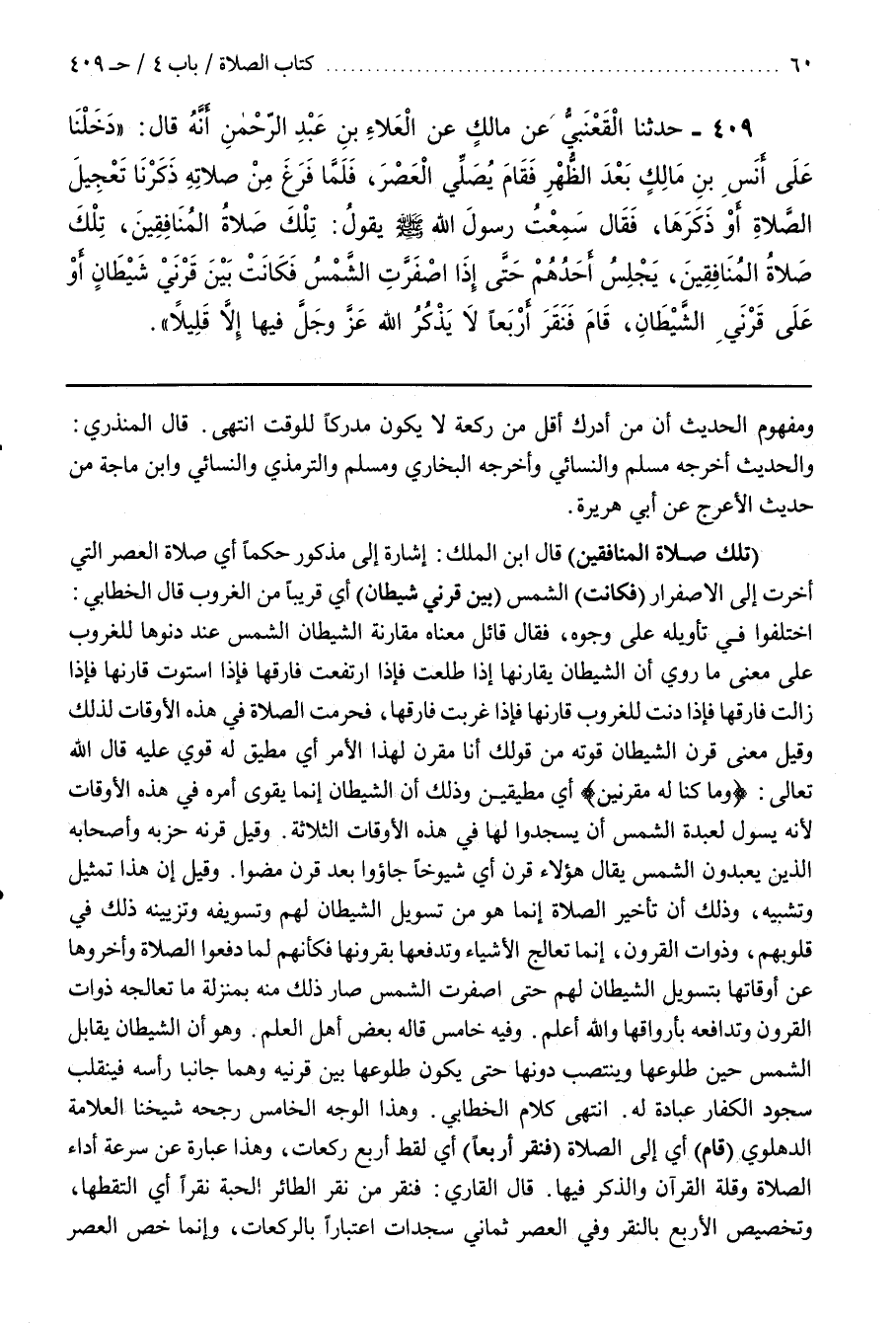 [413] (تلك صلاة المنافقين) قال بن الْمَلَكِ إِشَارَةٌ إِلَى مَذْكُورٍ حُكْمًا أَيْ صَلَاةُ الْعَصْرِ الَّتِي أُخِّرَتْ إِلَى الِاصْفِرَارِ (فَكَانَتْ) الشَّمْسُ (بَيْنَ قَرْنَيْ شَيْطَانٍ) أَيْ قَرِيبًا مِنَ الْغُرُوبِ قَالَ الْخَطَّابِيُّ اخْتَلَفُوا فِي تَأْوِيلِهِ عَلَى وُجُوهٍ فَقَالَ قَائِلٌ مَعْنَاهُ مُقَارَنَةُ الشَّيْطَانِ الشَّمْسَ عِنْدَ دُنُوِّهَا لِلْغُرُوبِ عَلَى مَعْنَى مَا رُوِيَ أَنَّ الشَّيْطَانَ يُقَارِنُهَا إِذَا طَلَعَتْ فَإِذَا ارْتَفَعَتْ فَارَقَهَا فَإِذَا اسْتَوَتْ قَارَنَهَا فَإِذَا زَالَتْ فَارَقَهَا فَإِذَا دَنَتْ لِلْغُرُوبِ قَارَنَهَا فَإِذَا غَرَبَتْ فَارَقَهَا فَحُرِّمَتِ الصَّلَاةُ فِي هَذِهِ الْأَوْقَاتِ لِذَلِكَ وَقِيلَ مَعْنَى قَرْنِ الشَّيْطَانِ قُوَّتُهُ مِنْ قَوْلِكَ أَنَا مُقْرِنٌ لِهَذَا الْأَمْرِ أَيْ مُطِيقٌ لَهُ قَوِيٌّ عَلَيْهِ قَالَ اللَّهُ تَعَالَى وَمَا كُنَّا لَهُ مُقْرِنِينَ أَيْ مُطِيقِينَ وَذَلِكَ أَنَّ الشَّيْطَانَ إِنَّمَا يَقْوَى أَمْرُهُ فِي هَذِهِ الْأَوْقَاتِ لِأَنَّهُ يُسَوِّلُ لِعَبَدَةِ الشَّمْسِ أَنْ يَسْجُدُوا لَهَا فِي هَذِهِ الْأَوْقَاتِ الثَّلَاثَةِ
