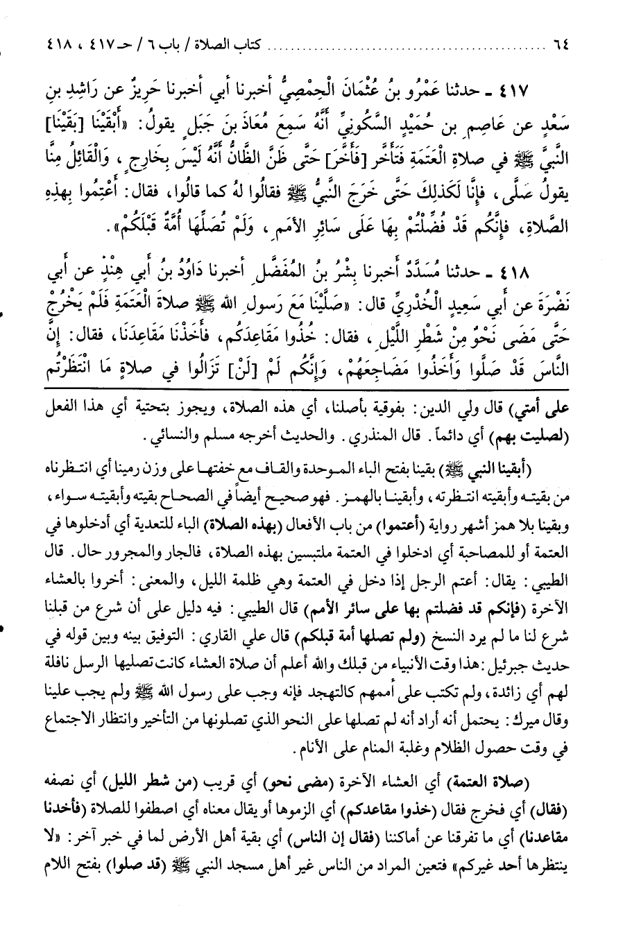 [422] (صَلَاةُ الْعَتَمَةِ) أَيِ الْعِشَاءُ الْآخِرَةِ (مَضَى نَحْوٌ) أَيْ قَرِيبٌ (مِنْ شَطْرِ اللَّيْلِ) أَيْ نِصْفِهِ (فَقَالَ) أَيْ فَخَرَجَ فَقَالَ (خُذُوا مَقَاعِدَكُمْ) أَيِ الْزَمُوهَا أَوْ يُقَالُ مَعْنَاهُ أَيِ اصْطَفُّوا لِلصَّلَاةِ (فَأَخَذْنَا مَقَاعِدَنَا) أَيْ مَا تَفَرَّقْنَا عن أما كننا (فَقَالَ إِنَّ النَّاسَ) أَيْ بَقِيَّةُ أَهْلِ الْأَرْضِ لِمَا فِي خَبَرٍ آخَرَ لَا يَنْتَظِرُهَا أَحَدٌ غَيْرُكُمْ فَتَعَيَّنَ الْمُرَادُ مِنَ النَّاسِ غَيْرُ أَهْلِ مَسْجِدِ النَّبِيِّ صَلَّى اللَّهُ عَلَيْهِ وَسَلَّمَ (قَدْ صَلَّوْا) بِفَتْحِ اللَّامِ