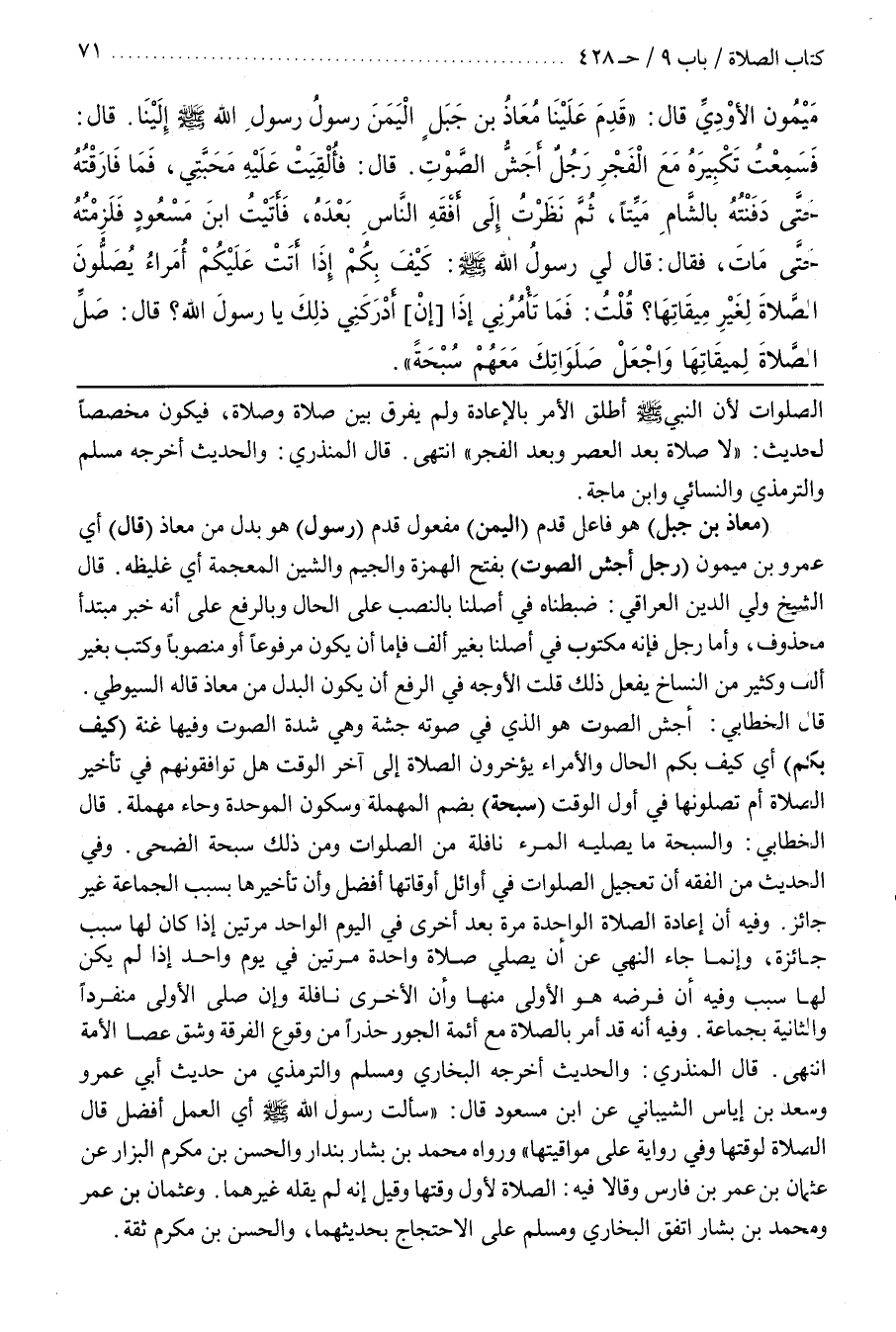 [432] (مُعَاذُ بْنُ جَبَلٍ) هُوَ فَاعِلُ قَدِمَ (الْيُمْنَ) مَفْعُولُ قَدِمَ (رَسُولُ) هُوَ بَدَلٌ مِنْ مُعَاذٍ (قَالَ) أَيْ عَمْرُو بْنُ مَيْمُونَ (رَجُلٌ أَجَشُّ الصَّوْتِ) بِفَتْحِ الْهَمْزَةِ وَالْجِيمِ وَالشِّينِ الْمُعْجَمَةِ أَيْ غَلِيظَةٍ قَالَ الشَّيْخُ وَلِيُّ الدِّينِ الْعِرَاقِيُّ ضَبَطْنَاهُ فِي أَصْلُنَا بِالنَّصْبِ عَلَى الْحَالِ وَبِالرَّفْعِ عَلَى أَنَّهُ خَبَرُ مُبْتَدَأٍ مَحْذُوفٍ وَأَمَّا رَجُلٌ فَإِنَّهُ مَكْتُوبٌ فِي أَصْلِنَا بِغَيْرِ أَلِفٍ فَإِمَّا أَنْ يَكُونَ مَرْفُوعًا أَوْ مَنْصُوبًا وَكُتِبَ بِغَيْرِ أَلِفٍ وَكَثِيرٌ مِنَ النُّسَّاخِ يَفْعَلُ ذَلِكَ قُلْتُ الْأَوْجَهُ فِي الرَّفْعِ أَنْ يَكُونَ الْبَدَلُ مِنْ مُعَاذٍ قَالَهُ السُّيُوطِيُّ قَالَ الْخَطَّابِيُّ أَجَشُّ الصَّوْتِ هُوَ الَّذِي فِي صَوْتِهِ جَشَّةٌ وَهِيَ شِدَّةُ الصَّوْتِ وَفِيهَا غُنَّةٌ (كَيْفَ بِكُمْ) أَيْ كَيْفَ بِكُمُ الْحَالُ وَالْأُمَرَاءُ يُؤَخِّرُونَ الصَّلَاةَ إِلَى آخِرِ الْوَقْتِ هَلْ تُوَافِقُونَهُمْ فِي تَأْخِيرِ الصَّلَاةِ أَمْ تُصَلُّونَهَا فِي أَوَّلِ الْوَقْتِ (سُبْحَةً) بِضَمِّ الْمُهْمَلَةِ وَسُكُونِ الْمُوَحَّدَةِ وَحَاءٍ مُهْمَلَةٍ قَالَ الْخَطَّابِيُّ وَالسُّبْحَةُ مَا يُصَلِّيهُ الْمَرْءُ نَافِلَةً مِنَ الصَّلَوَاتِ وَمِنْ ذَلِكَ سُبْحَةُ الضُّحَى