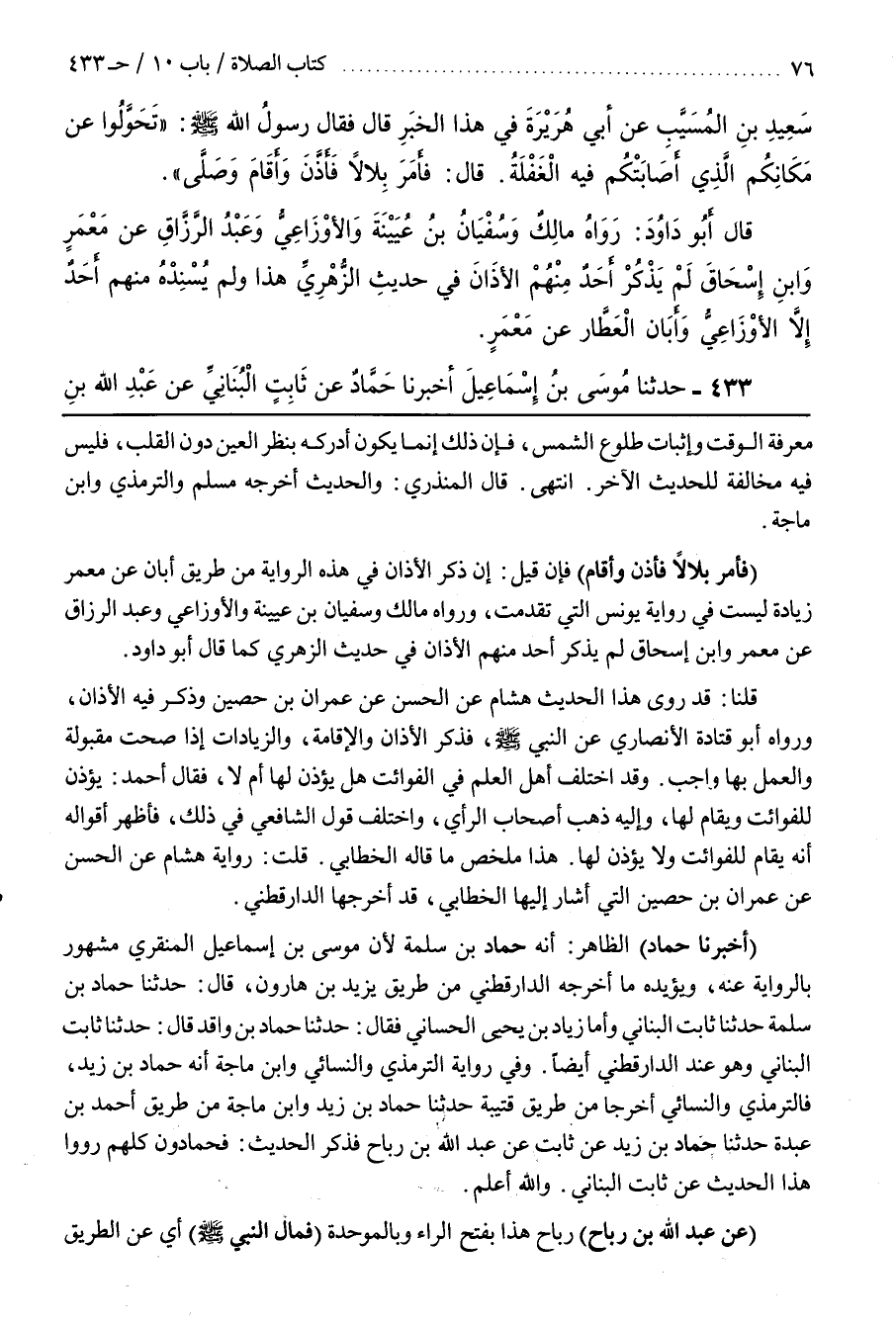 [437] (أَخْبَرَنَا حَمَّادٌ) الظَّاهِرُ أَنَّهُ حَمَّادُ بْنُ سَلَمَةَ لِأَنَّ مُوسَى بْنَ إِسْمَاعِيلَ الْمَنْقَرِيَّ مَشْهُورُ بِالرِّوَايَةِ عَنْهُ وَيُؤَيِّدُهُ مَا أَخْرَجَهُ الدَّارَقُطْنِيُّ مِنْ طَرِيقِ يَزِيدَ بْنِ هَارُونَ قَالَ حَدَّثَنَا حَمَّادُ بْنُ سَلَمَةَ حَدَّثَنَا ثَابِتٌ الْبُنَانِيُّ وَأَمَّا زِيَادُ بْنُ يَحْيَى الْحَسَّانِيُّ فَقَالَ حَدَّثَنَا حَمَّادُ بْنُ وَاقَدِ قَالَ حَدَّثَنَا ثَابِتٌ الْبُنَانِيُّ وَهُوَ عِنْدَ الدَّارَقُطْنِيِّ أَيْضًا