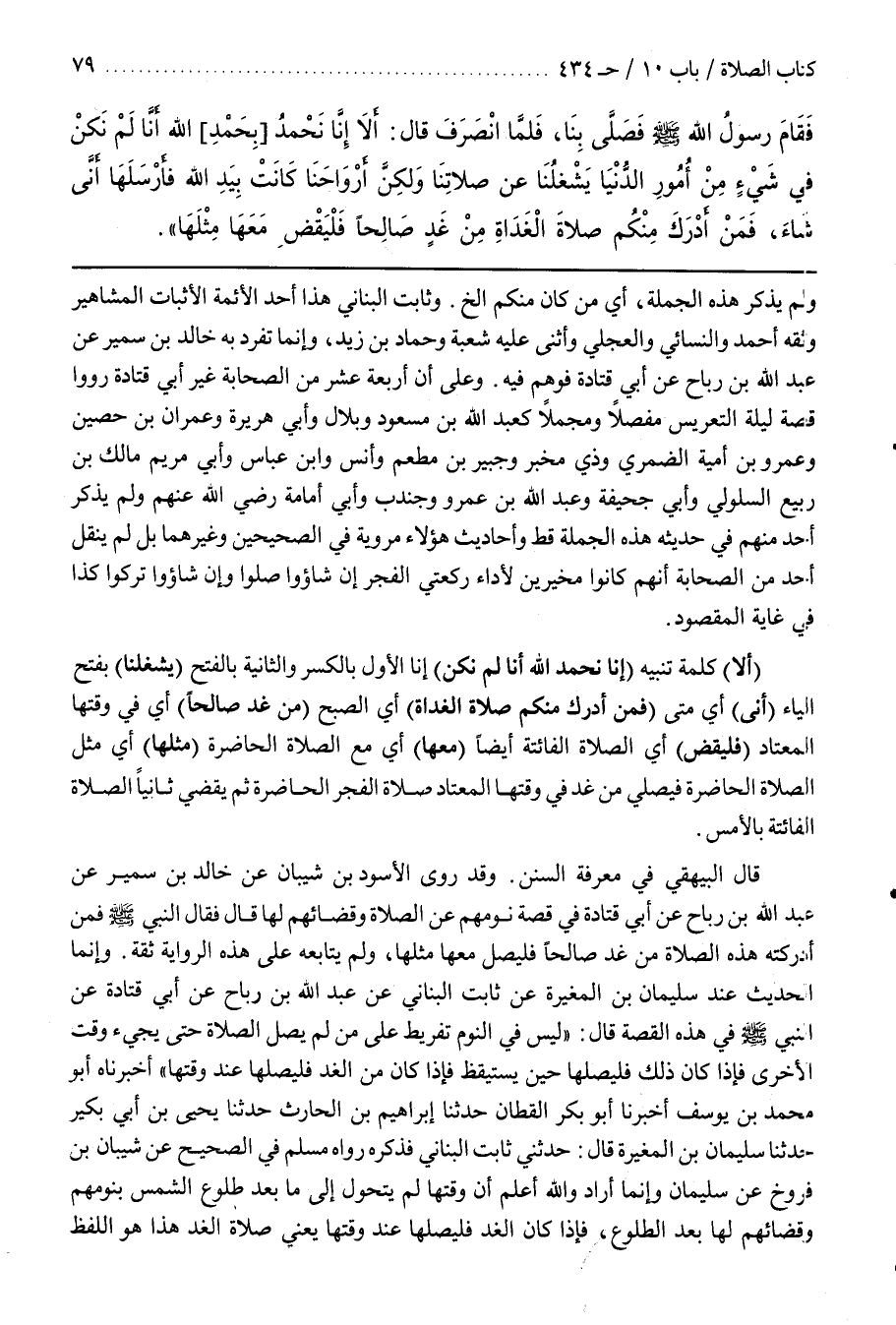 وَإِنَّمَا الْحَدِيثُ عِنْدَ سُلَيْمَانَ بْنِ الْمُغِيرَةَ عَنْ ثَابِتٍ الْبُنَانِيِّ عَنْ عَبْدِ اللَّهِ بْنِ رَبَاحٍ عَنْ أَبِي قَتَادَةَ عَنِ النَّبِيِّ فِي هَذِهِ الْقِصَّةِ قَالَ لَيْسَ فِي النَّوْمِ تَفْرِيطٌ عَلَى مَنْ لَمْ يُصَلِّ الصَّلَاةَ حَتَّى يَجِيءَ وَقْتُ الْأُخْرَى فَإِذَا كَانَ ذَلِكَ فَلْيُصَلِّهَا حِينَ يَسْتَيْقِظُ فَإِذَا كَانَ مِنَ الْغَدِ فَلْيُصَلِّهَا عِنْدَ وَقْتِهَا أَخْبَرَنَاهُ أَبُو مُحَمَّدِ بْنِ يُوسُفَ أَخْبَرَنَا أَبُو بَكْرٍ الْقَطَّانُ حَدَّثَنَا إِبْرَاهِيمُ بْنُ الْحَارِثِ حَدَّثَنَا يَحْيَى بْنُ أَبِي بُكَيْرٍ حَدَّثَنَا سُلَيْمَانُ بْنُ الْمُغِيرَةَ قَالَ حَدَّثَنِي ثَابِتٌ الْبُنَانِيُّ فَذَكَرَهُ رَوَاهُ مُسْلِمٌ فِي الصَّحِيحِ عَنْ شَيْبَانَ بْنِ فَرُّوخٍ عَنْ سُلَيْمَانَ وَإِنَّمَا أَرَادَ وَاللَّهُ أَعْلَمُ أَنَّ وَقْتَهَا لَمْ يَتَحَوَّلْ إِلَى مَا بَعْدَ طُلُوعِ الشَّمْسِ بِنَوْمِهِمْ وَقَضَائِهِمْ لَهَا بَعْدَ الطُّلُوعِ فَإِذَا كَانَ الْغَدُ فَلْيُصَلِّهَا عِنْدَ وَقْتِهَا يَعْنِي صَلَاةَ الْغَدِ هَذَا هُوَ اللَّفْظُ