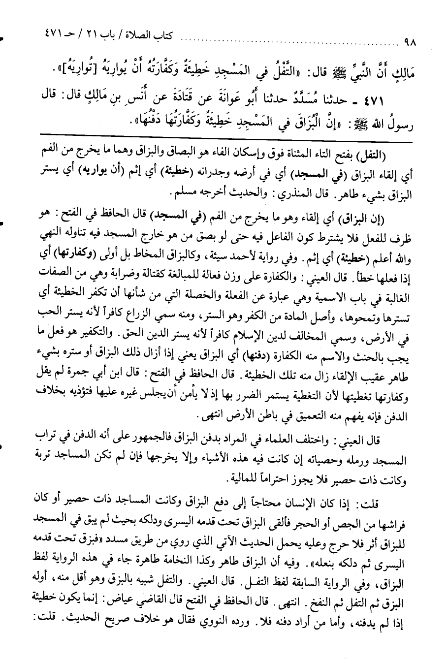 قُلْتُ إِذَا كَانَ الْإِنْسَانُ مُحْتَاجًا إِلَى دَفْعِ الْبُزَاقِ وَكَانَتِ الْمَسَاجِدُ ذَاتَ حَصِيرٍ أَوْ كَانَ فِرَاشُهَا مِنَ الْجِصِّ أَوِ الْحَجَرِ فَأَلْقَى الْبُزَاقَ تَحْتَ قَدَمِهِ الْيُسْرَى وَدَلَكَهُ بِحَيْثُ لَمْ يَبْقَ فِي الْمَسْجِدِ لِلْبُزَاقِ أَثَرٌ فَلَا حَرَجَ وَعَلَيْهِ يُحْمَلُ الْحَدِيثُ الْآتِي الَّذِي رُوِيَ مِنْ طَرِيقِ مُسَدَّدٍ فَبَزَقَ تَحْتَ قَدَمِهِ الْيُسْرَى ثُمَّ دَلَكَهُ بِنَعْلِهِ