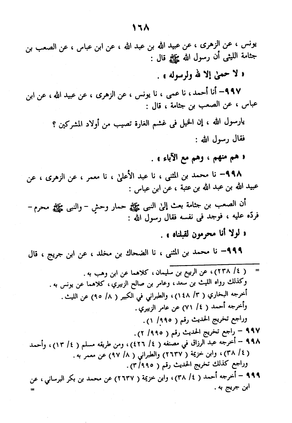 998 - نَا مُحَمَّدُ بْنُ الْمُثَنَّى، نَا عَبْدُ الْأَعْلَى , نَا مَعْمَرٌ، عَنِ الزُّهْرِيِّ، عَنْ عُبَيْدِ اللَّهِ بْنِ عَبْدِ اللَّهِ بْنِ عُتْبَةَ، عَنِ ابْنِ عَبَّاسٍ: أَنَّ الصَّعْبَ بْنَ جَثَّامَةَ بَعَثَ إِلَى النَّبِيِّ صَلَّى اللهُ عَلَيْهِ وَسَلَّمَ حِمَارَ وَحْشٍ، وَالنَّبِيُّ صَلَّى اللهُ عَلَيْهِ وَسَلَّمَ مُحْرِمٌ فَرَدَّهُ عَلَيْهِ، فَوَجَدَ فِي نَفْسِهِ، فَقَالَ رَسُولُ اللَّهِ: «§لَوْلَا أَنَّا مُحْرِمُونَ لَقَبِلْنَاهُ»