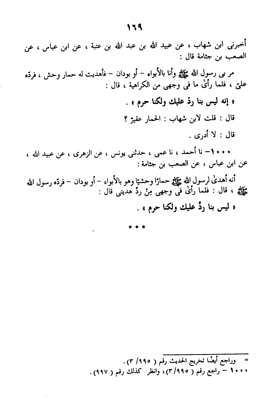 1000 - نَا أَحْمَدُ، نَا عَمِّي، حَدَّثَنِي يُونُسُ، عَنِ الزُّهْرِيِّ , عَنْ عُبَيْدِ اللَّهِ، عَنِ ابْنِ عَبَّاسٍ ,، عَنِ الصَّعْبِ بْنِ جَثَّامَةَ أَنَّهُ أَهْدَى لِرَسُولِ اللَّهِ صَلَّى اللهُ عَلَيْهِ وَسَلَّمَ حِمَارًا وَحْشِيًّا وَهُوَ بِالْأَبْوَاءِ أَوْ بِوَدَّانَ، فَرَدَّهُ رَسُولُ اللَّهِ صَلَّى اللهُ عَلَيْهِ وَسَلَّمَ، قَالَ: فَلَمَّا رَأَى فِي وَجْهِي مِنْ رَدِّ هَدِيَّتِي قَالَ: «§لَيْسَ بِنَا رَدٌّ عَلَيْكَ، وَلَكِنَّا حُرُمٌ»