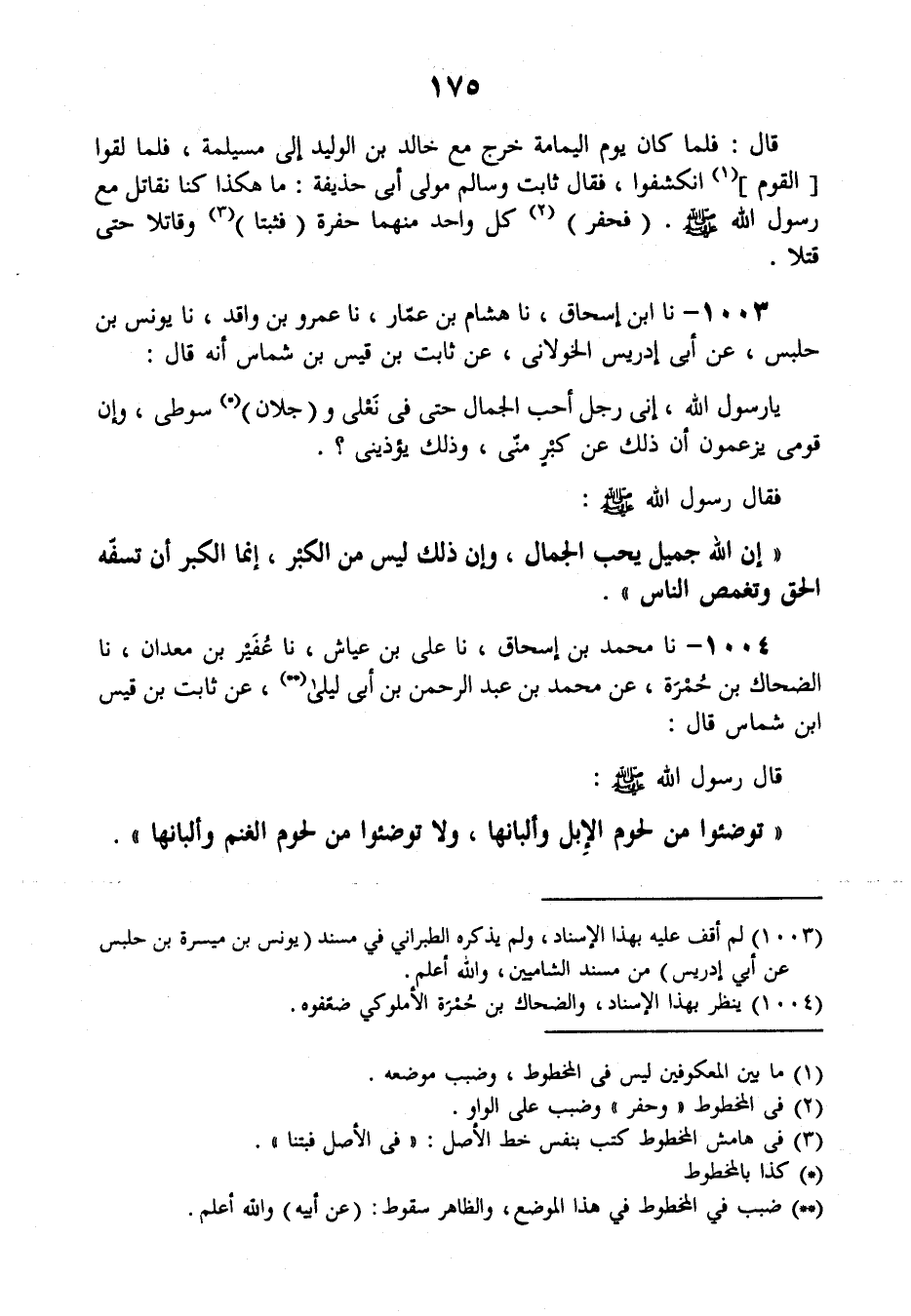 1003 - نَا ابْنُ إِسْحَاقَ , نَا هِشَامُ بْنُ عَمَّارٍ، نَا عَمْرُو بْنُ وَاقِدٍ، نَا يُونُسُ بْنُ حَلْبَسٍ، عَنْ أَبِي إِدْرِيسَ الْخَوْلَانِيِّ , عَنْ ثَابِتِ بْنِ قَيْسِ بْنِ شَمَّاسٍ أَنَّهُ قَالَ: يَا رَسُولَ اللَّهِ، إِنَّى رَجُلٌ أُحِبُّ الْجَمَالَ حَتَّى فِي نَعْلِي وَجِلَاءِ سَوْطِي، وَإِنَّ قَوْمِي يَزْعُمُونَ أَنَّ ذَلِكَ عَنْ كِبْرٍ مِنِّي وَذَلِكَ يُؤْذِينِي، فَقَالَ رَسُولُ اللَّهِ صَلَّى اللهُ عَلَيْهِ وَسَلَّمَ: «إِنَّ §اللَّهَ جَمِيلٌ يُحِبُّ الْجَمَالَ، وَإِنَّ ذَلِكَ لَيْسَ مِنَ الْكِبْرِ، إِنَّمَا الْكِبْرُ أَنْ تُسَفِّهَ الْحَقَّ وَتغْمِصَ النَّاسَ»