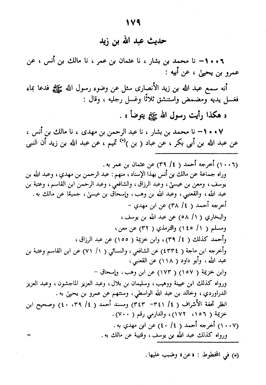 1006 - نَا مُحَمَّدُ بْنُ بَشَّارٍ، نَا عُثْمَانُ بْنُ عُمَرَ، نَا مَالِكُ بْنُ أَنَسٍ، عَنْ عَمْرِو بْنِ يَحْيَى، عَنْ أَبِيهِ أَنَّهُ سَمِعَ عَبْدَ اللَّهِ بْنَ زَيْدٍ الْأَنْصَارِيَّ , سُئِلَ عَنْ وُضُوءِ رَسُولِ اللَّهِ صَلَّى اللهُ عَلَيْهِ وَسَلَّمَ، فَدَعَا بِمَاءٍ §فَغَسَلَ يَدَيْهِ، وَمَضْمَضَ وَاسْتَنْشَقَ ثَلَاثًا، وَغَسَلَ رِجْلَيْهِ، وَقَالَ: هَكَذَا رَأَيْتُ رَسُولَ اللَّهِ صَلَّى اللهُ عَلَيْهِ وَسَلَّمَ يَتَوَضَّأُ