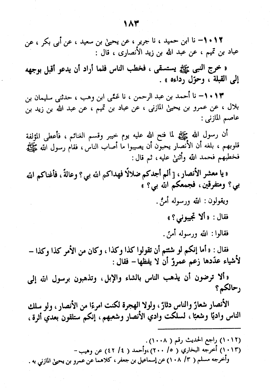 1013 - نَا أَحْمَدُ بْنُ عَبْدِ الرَّحْمَنِ، نَا عَمِّي ابْنُ وَهْبٍ، حَدَّثَنِي سُلَيْمَانُ بْنُ بِلَالٍ، عَنْ عَمْرِو بْنِ يَحْيَى الْمَازِنِيِّ، عَنْ عَبَّادِ بْنِ تَمِيمٍ، عَنْ عَبْدِ اللَّهِ بْنِ زَيْدِ بْنِ عَاصِمٍ الْمَازِنِيِّ أَنَّ رَسُولَ اللَّهِ صَلَّى اللهُ عَلَيْهِ وَسَلَّمَ لَمَّا فَتَحَ اللَّهَ عَلَيْهِ يَوْمَ خَيْبَرَ وَقَسَمَ الْغَنَائِمَ فَأَعْطَى الْمُؤَلَّفَةَ قُلُوبُهُمْ، بَلَغَهُ أَنَّ الْأَنْصَارَ يُحِبُّونُ أَنْ يُصِيبُوا مَا أَصَابَ النَّاسُ، فَقَامَ رَسُولُ اللَّهِ صَلَّى اللَّهُ عَلَيْهِ وَسَلمَ فَخَطَبَهُمْ، فَحَمِدَ اللَّهَ وَأَثْنَى عَلَيْهِ، ثُمَّ قَالَ: «يَا مَعْشَرَ الْأَنْصَارِ §أَلَمْ أَجِدْكُمْ ضُلَّالًا فَهَدَاكُمُ اللَّهُ بِي، وَعَالَةً فَأَغْنَاكُمُ اللَّهُ بِي، وَمُتَفَرِّقِينَ فَجَمَعَكُمُ اللَّهُ بِي؟» ، وَيَقُولُونَ: اللَّهُ وَرَسُولُهُ أَمَنُّ، فَقَالَ: «أَلَا تُجِيبُونِي؟» . فَقَالُوا: اللَّهُ وَرَسُولُهُ أَمَنُّ، فَقَالَ: «أَمَا إِنَّكُمْ لَوْ شِئْتُمُ أَنْ تَقُولُوا» كَذَا وَكَذَا، وَكَانَ مِنَ الْأَمْرِ كَذَا وَكَذَا لِأَشْيَاءَ عَدَّدَهَا زَعَمُ عَمْرٌو أَنْ لَا يَحْفَظَهَا فَقَالَ: «أَلَا تَرْضَوْنَ أَنْ يَذْهَبَ النَّاسُ بِالشَّاءِ وَالْإِبِلِ، وَتَذْهَبُونَ بِرَسُولِ اللَّهِ إِلَى رِحَالِكُمْ، الْأَنْصَارُ شِعَارٌ، وَالنَّاسُ دِثَارٌ، وَلَوْلَا الْهِجْرَةُ لَكُنْتُ امْرَءًا مِنَ الْأَنْصَارِ، وَلَوْ سَلَكَ النَّاسُ وَادِيًا وَشِعْبًا لَسَلَكْتُ وَادِيَ الْأَنْصَارِ وَشِعْبَهُمْ، إِنَّكُمْ سَتَلْقَوْنَ بَعْدِي أَثَرَةً -[184]- فَاصْبِرُوا حَتَّى تَلْقَوْنِي عَلَى الْحَوْضِ»